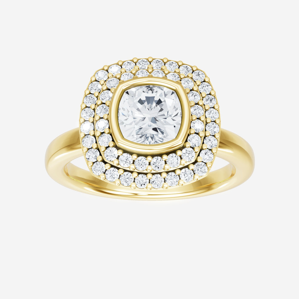 You’ve designed a ring that reflects lasting elegance and grace! Crafted from 14K Yellow Gold, this exquisite Cushion lab-grown diamond is the centerpiece of this unique design. This Basic Plain Shank with a Bezel Set Center With Double Halo head showcases the brilliance of the Cushion diamond, creating a timeless look. It's a piece of elegance and beauty, perfect for marking life's most beautiful occasions.