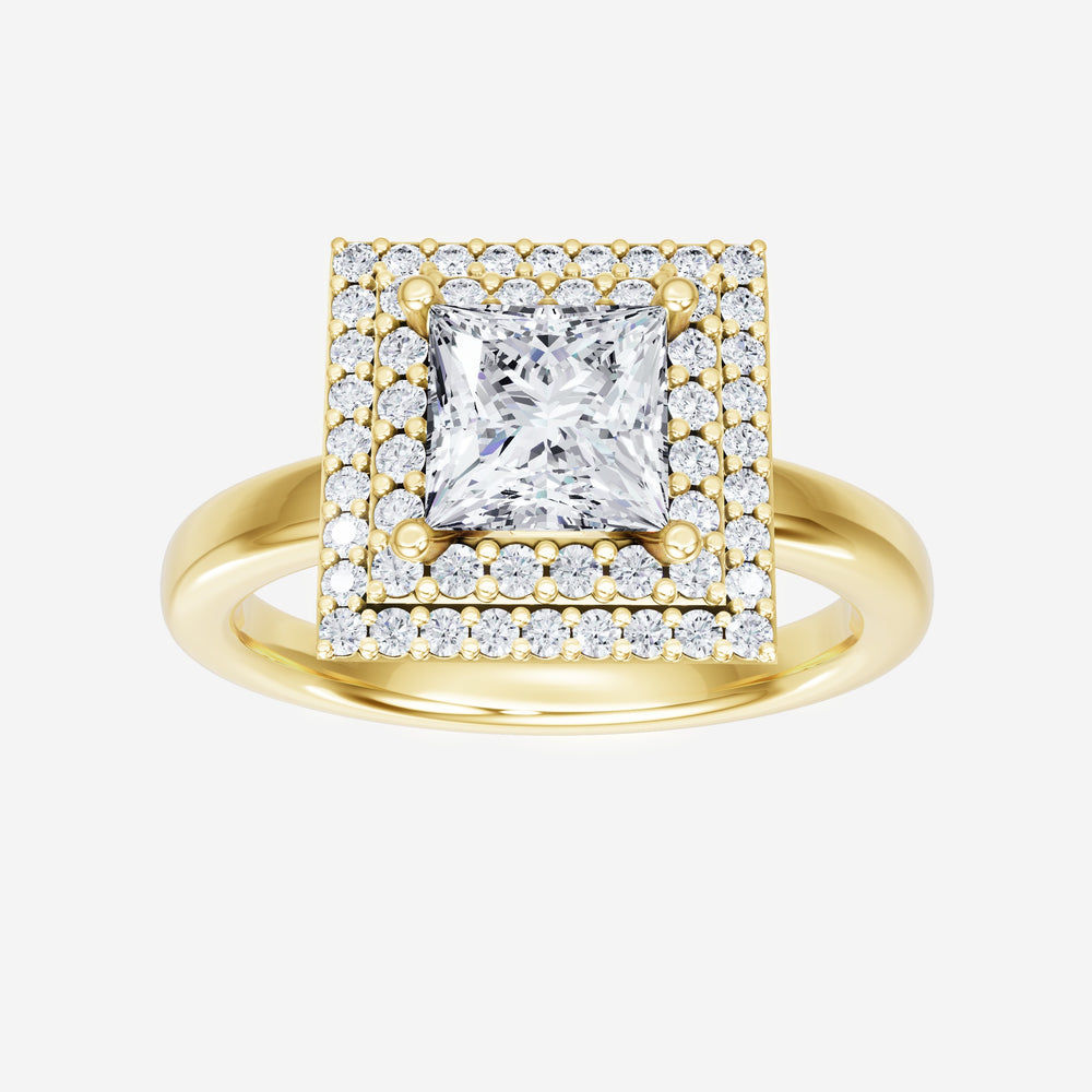 ¡Ha diseñado un anillo que refleja elegancia y gracia duraderas! Este exquisito diamante princesa creado en laboratorio, elaborado en oro amarillo de 14 quilates, es la pieza central de este diseño único. Este anillo básico liso con cabeza de halo doble muestra el brillo del diamante princesa y crea un estilo atemporal. Esta elegante pieza es el símbolo perfecto del amor, la fuerza y ​​la belleza atemporal.