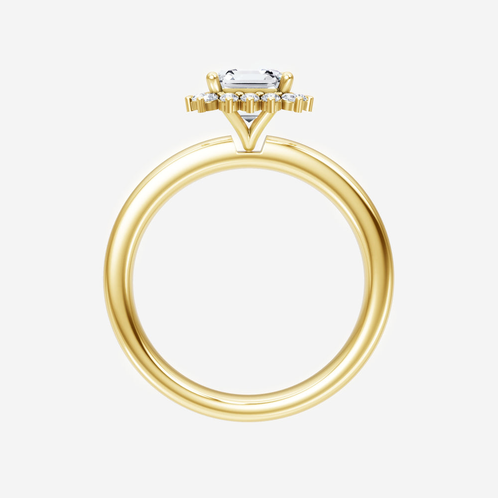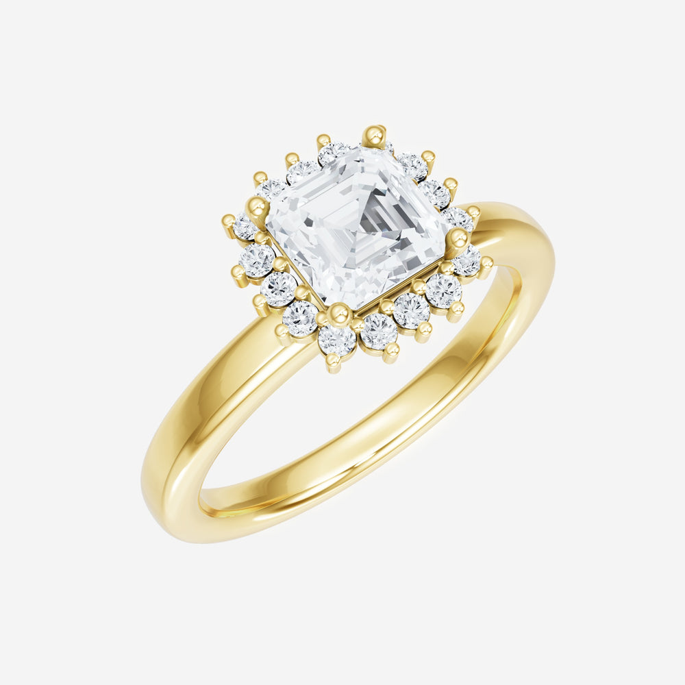 ¡Ha diseñado un anillo que refleja elegancia y gracia duraderas! Este exquisito diamante Asscher cultivado en laboratorio, elaborado en oro amarillo de 14 quilates, es la pieza central de este diseño único. Este anillo sencillo básico con cabeza de halo Diana muestra el brillo del diamante Asscher y crea un estilo atemporal. Esta elegante pieza es el símbolo perfecto del amor, la fuerza y ​​la belleza atemporal.