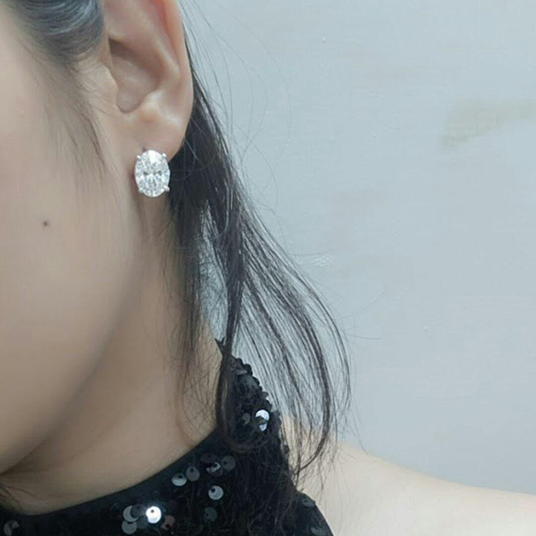 Both diamonds match perfectly in color and size. The oval shape gives a unique yet subtle shine.