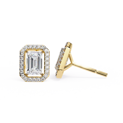 Make a statement with these exquisite lab-grown radiant cut diamond earrings, meticulously crafted in your choice of 14K or 18K yellow, white, or rose gold. Featuring a captivating radiant cut diamond as the centerpiece, surrounded by a halo of shimmering accent diamonds, these earrings offer a perfect blend of elegance and modern flair.