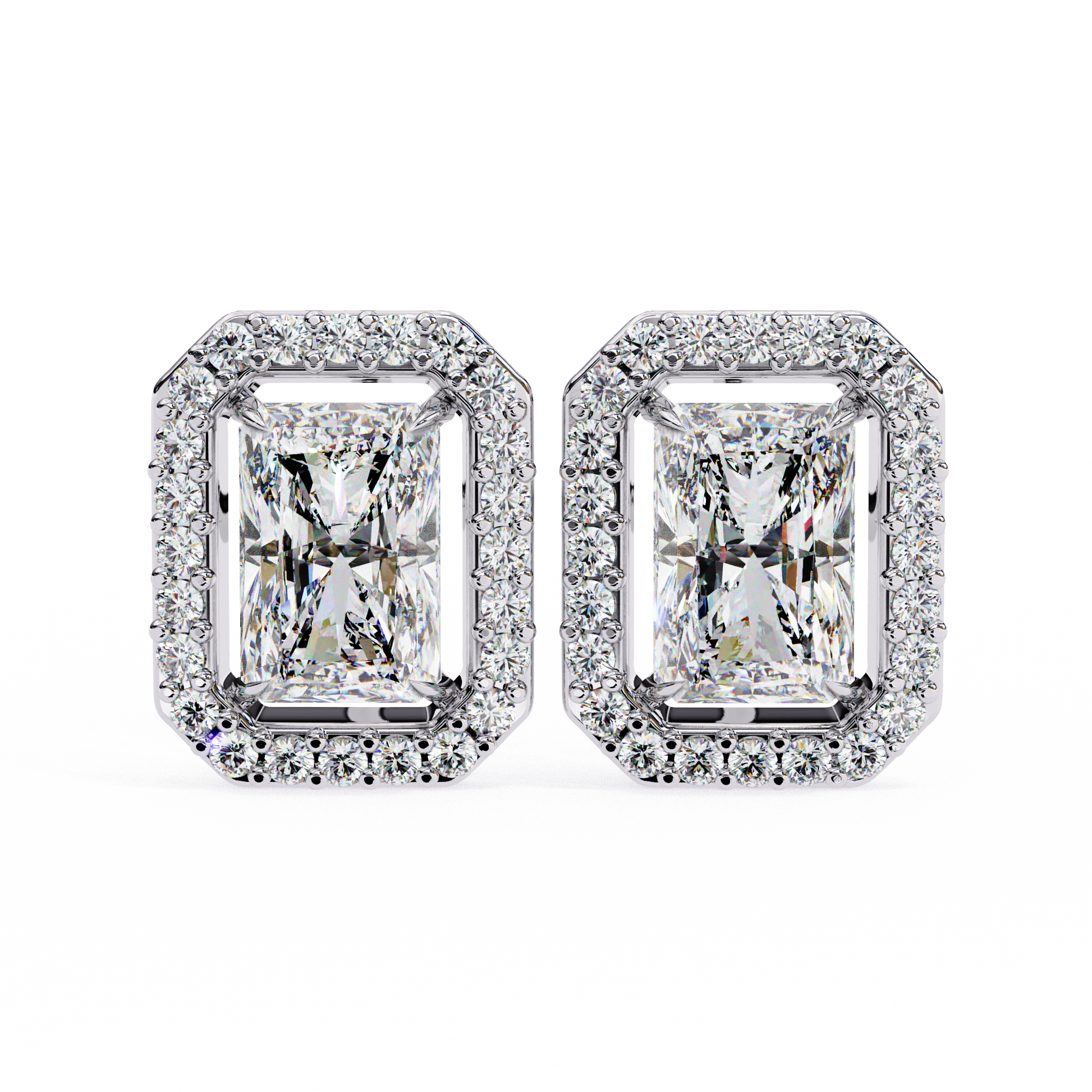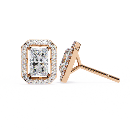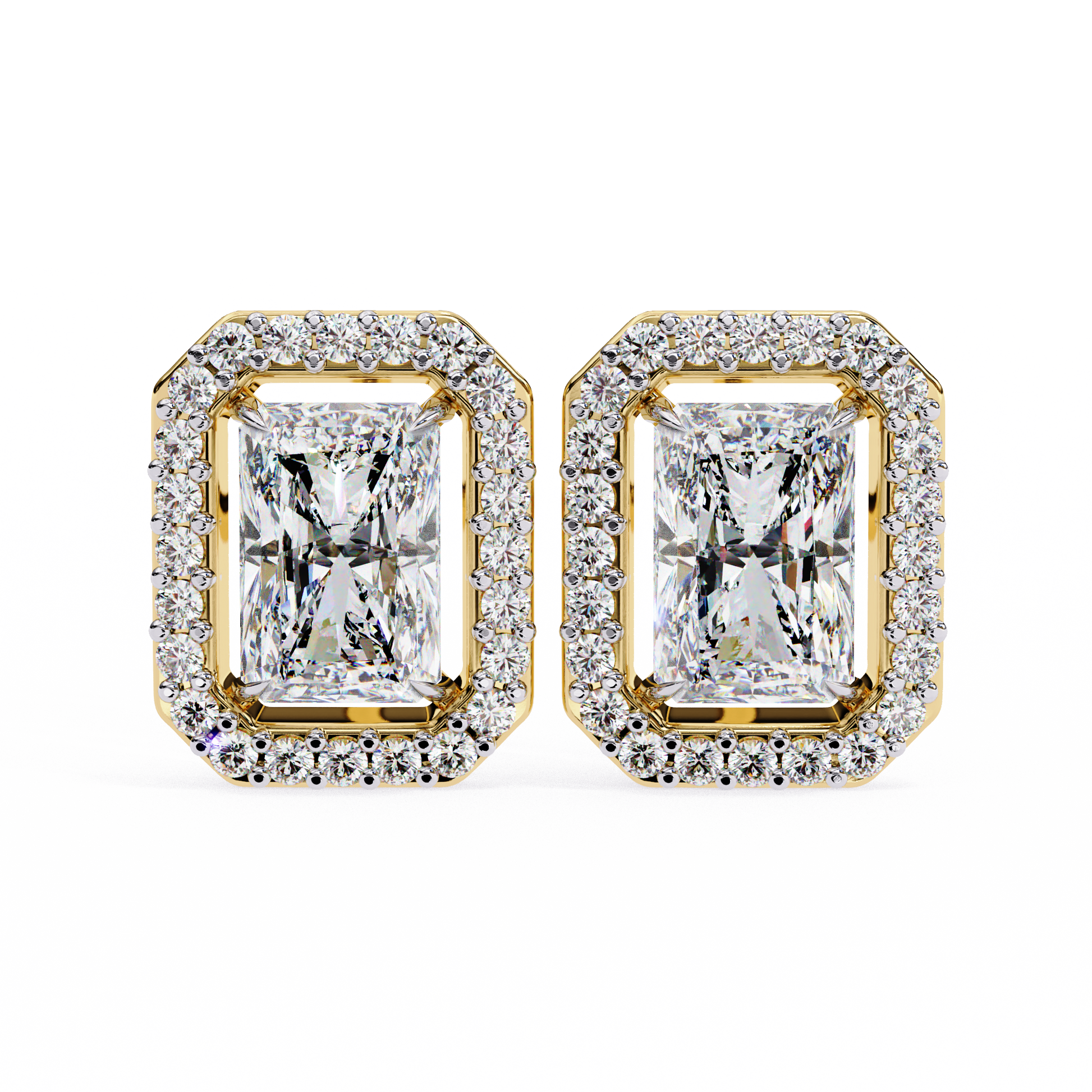 Make a statement with these exquisite lab-grown radiant cut diamond earrings, meticulously crafted in your choice of 14K or 18K yellow, white, or rose gold. Featuring a captivating radiant cut diamond as the centerpiece, surrounded by a halo of shimmering accent diamonds, these earrings offer a perfect blend of elegance and modern flair.