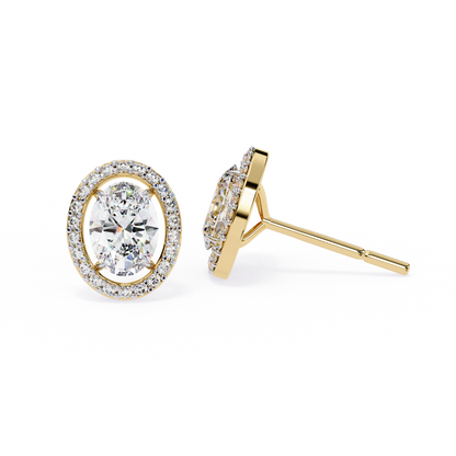 Discover the allure of these exquisite lab-grown oval diamond stud earrings, expertly crafted in your choice of 14K or 18K yellow, white, or rose gold. Featuring a mesmerizing oval-cut diamond surrounded by a halo of sparkling accent diamonds, these earrings embody elegance and sophistication, perfect for elevating any look.
