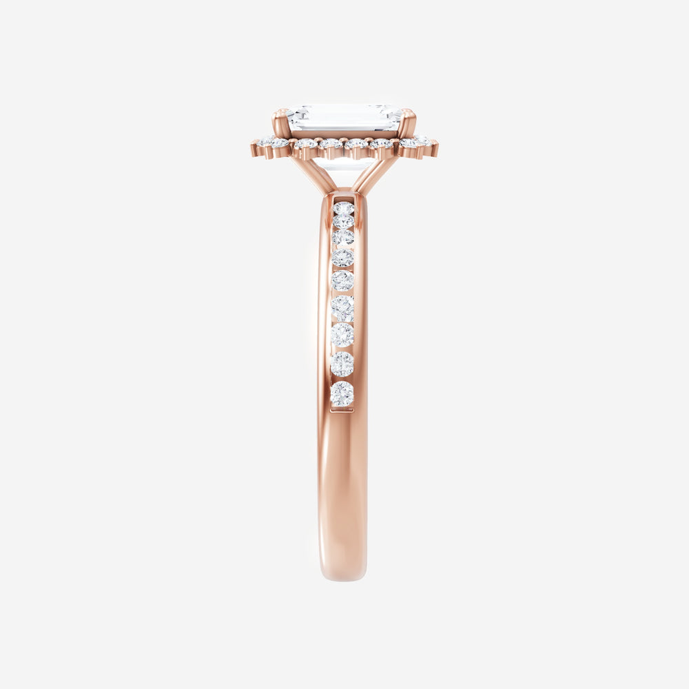 You’ve designed a ring that reflects lasting elegance and grace! Crafted from 14k Rose Gold, this exquisite Emerald lab-grown diamond is the centerpiece of this unique design. This Channel Set Shank with a Diana Halo head showcases the brilliance of the Emerald diamond, creating a timeless look. This stunning ring makes the perfect symbol of everlasting love and devotion.