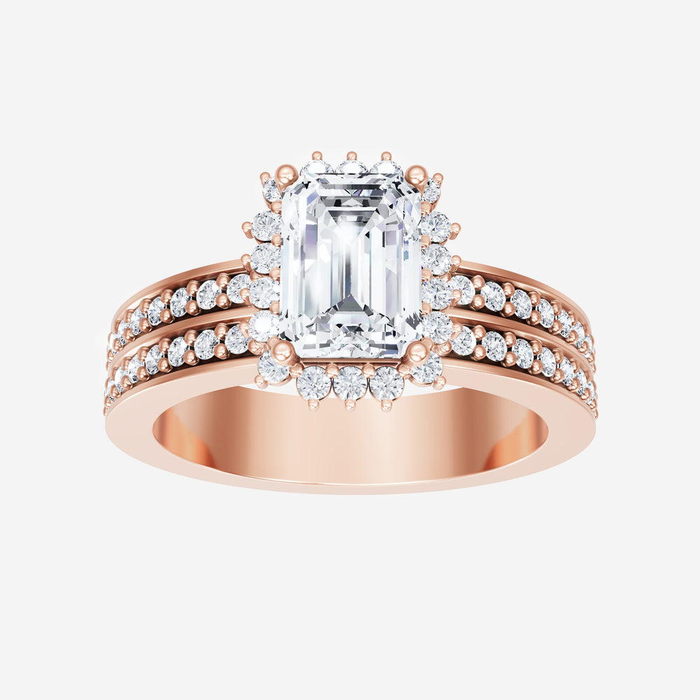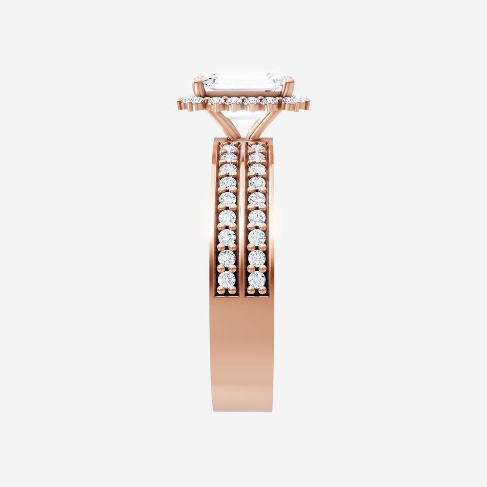 You’ve designed a ring that reflects lasting elegance and grace! Crafted from 14k Rose Gold, this exquisite Emerald lab-grown diamond is the centerpiece of this unique design. This Double Row Pave with a Diana Halo head showcases the brilliance of the Emerald diamond, creating a timeless look. Ideal for those who seek both beauty and meaning, this ring will stand as a testament to cherished memories.
