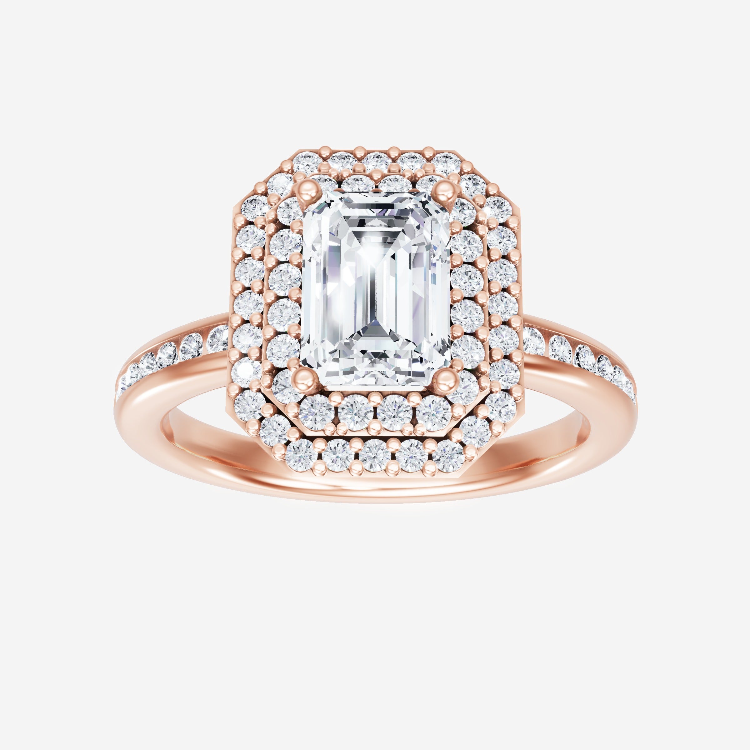 You’ve designed a ring that reflects lasting elegance and grace! Crafted from 14k Rose Gold, this exquisite Emerald lab-grown diamond is the centerpiece of this unique design. This Channel Set Shank with a Double Halo head showcases the brilliance of the Emerald diamond, creating a timeless look. It's a piece of elegance and beauty, perfect for marking life's most beautiful occasions.