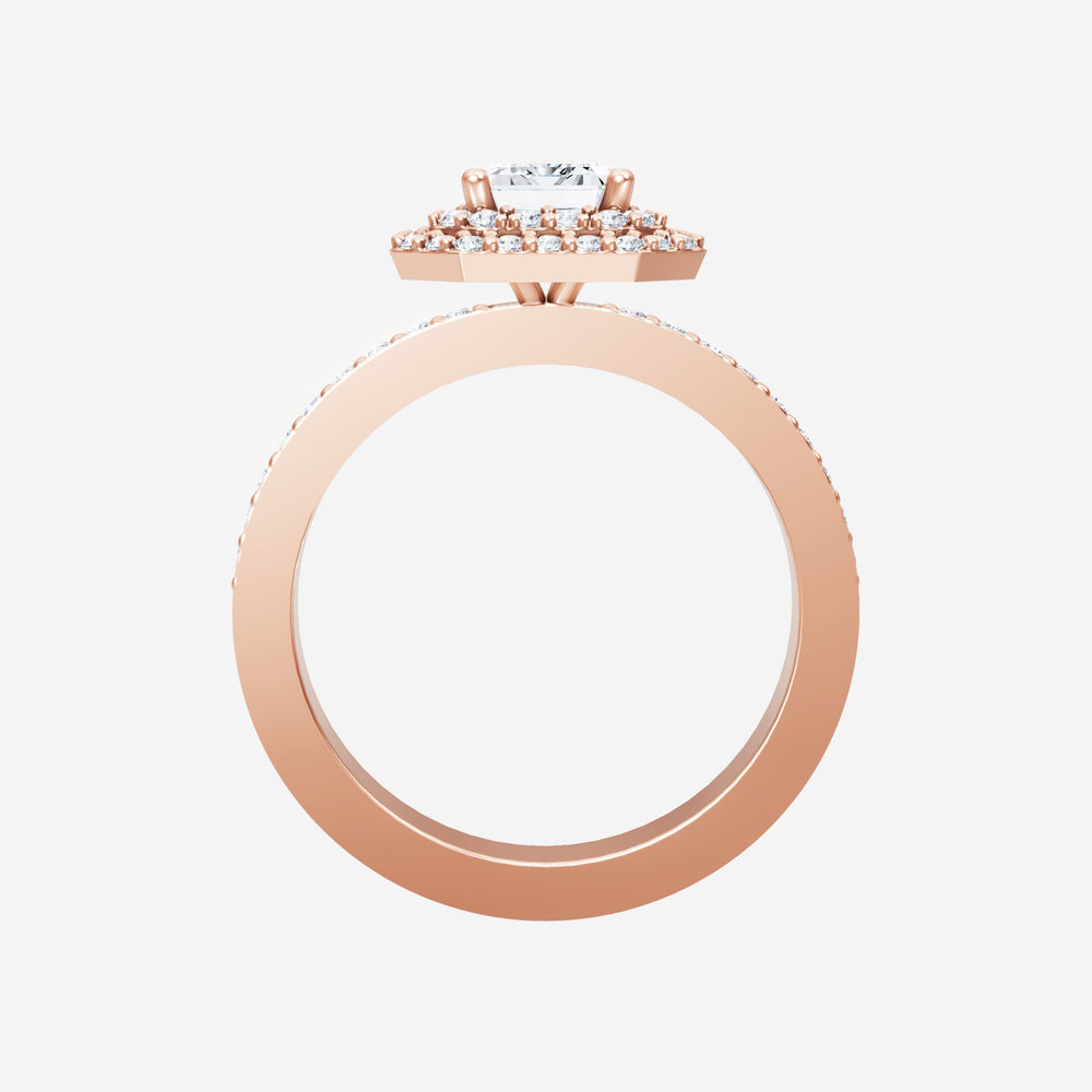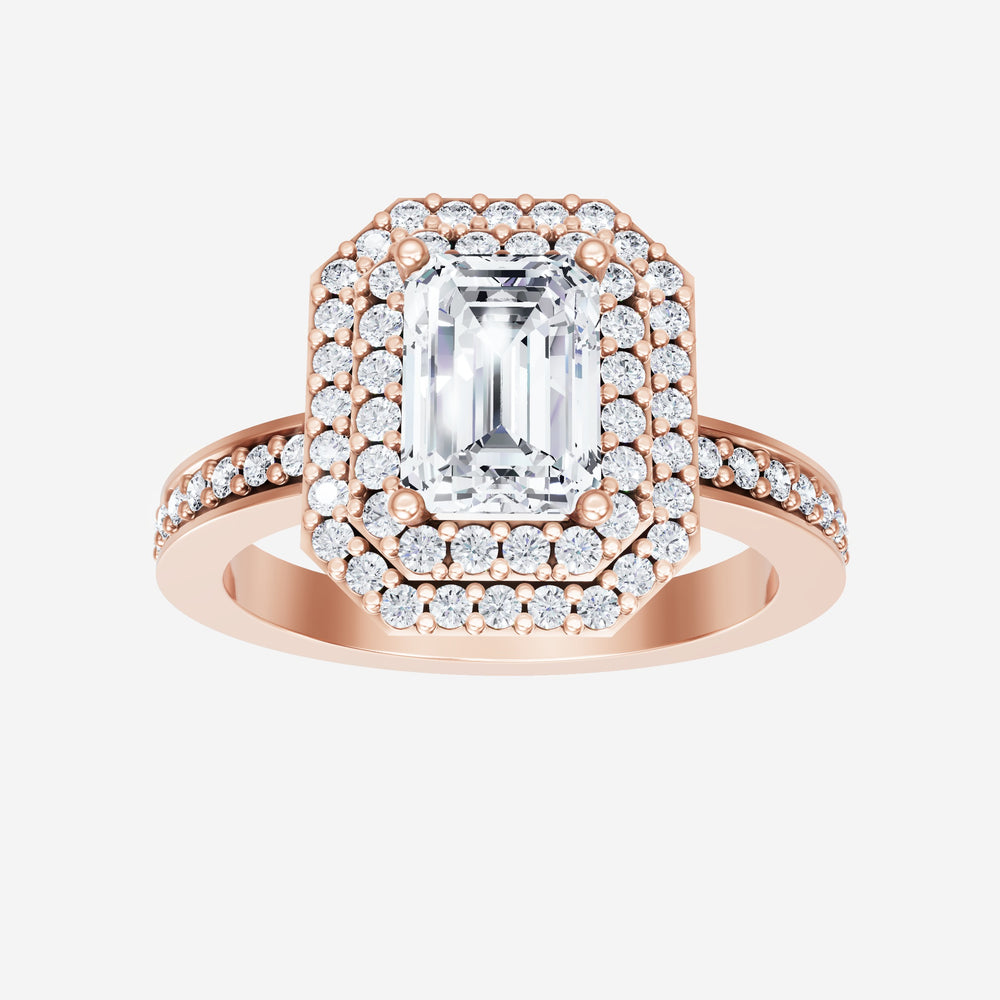 You’ve designed a ring that reflects lasting elegance and grace! Crafted from 14k Rose Gold, this exquisite Emerald lab-grown diamond is the centerpiece of this unique design. This Single Pave Shank with a Double Halo head showcases the brilliance of the Emerald diamond, creating a timeless look. This ring will become a cherished reminder of life's most treasured moments.