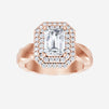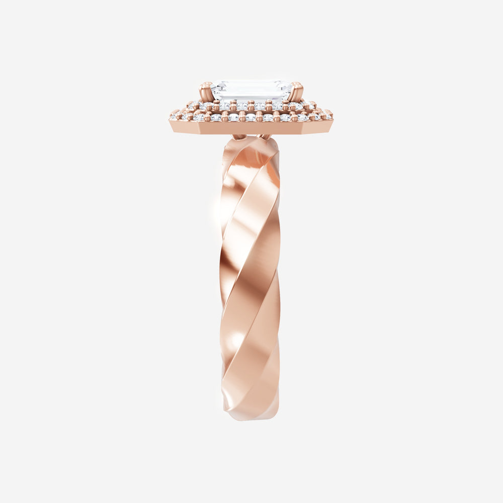 You’ve designed a ring that reflects lasting elegance and grace! Crafted from 14k Rose Gold, this exquisite Emerald lab-grown diamond is the centerpiece of this unique design. This Twisted Shank with a Double Halo head showcases the brilliance of the Emerald diamond, creating a timeless look. It's a piece of elegance and beauty, perfect for marking life's most beautiful occasions.