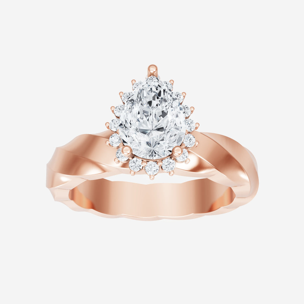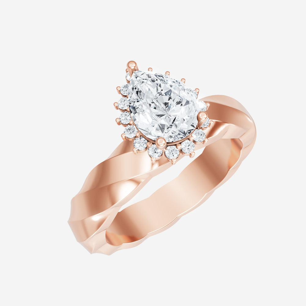 You’ve designed a ring that reflects lasting elegance and grace! Crafted from 14k Rose Gold, this exquisite Pear lab-grown diamond is the centerpiece of this unique design. This Twisted Shank with a Diana Halo head showcases the brilliance of the Pear diamond, creating a timeless look. This elegant piece is the perfect symbol of love, strength, and timeless beauty.