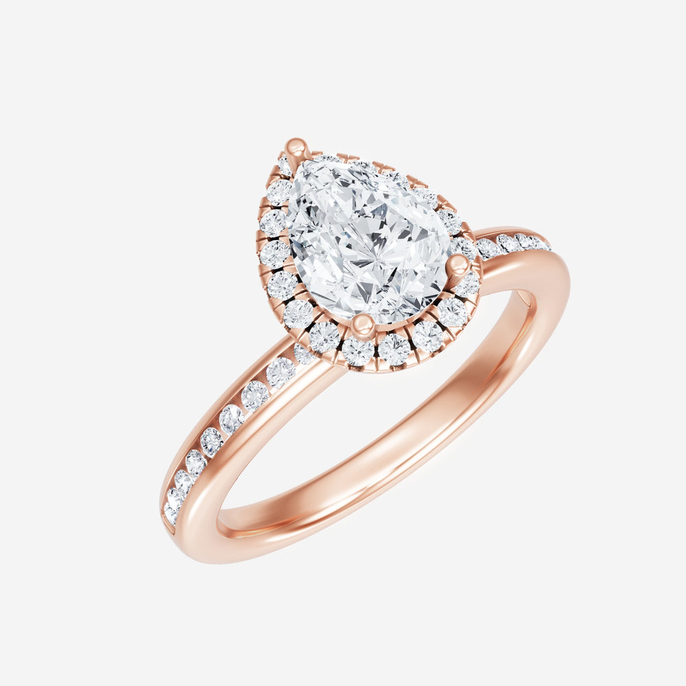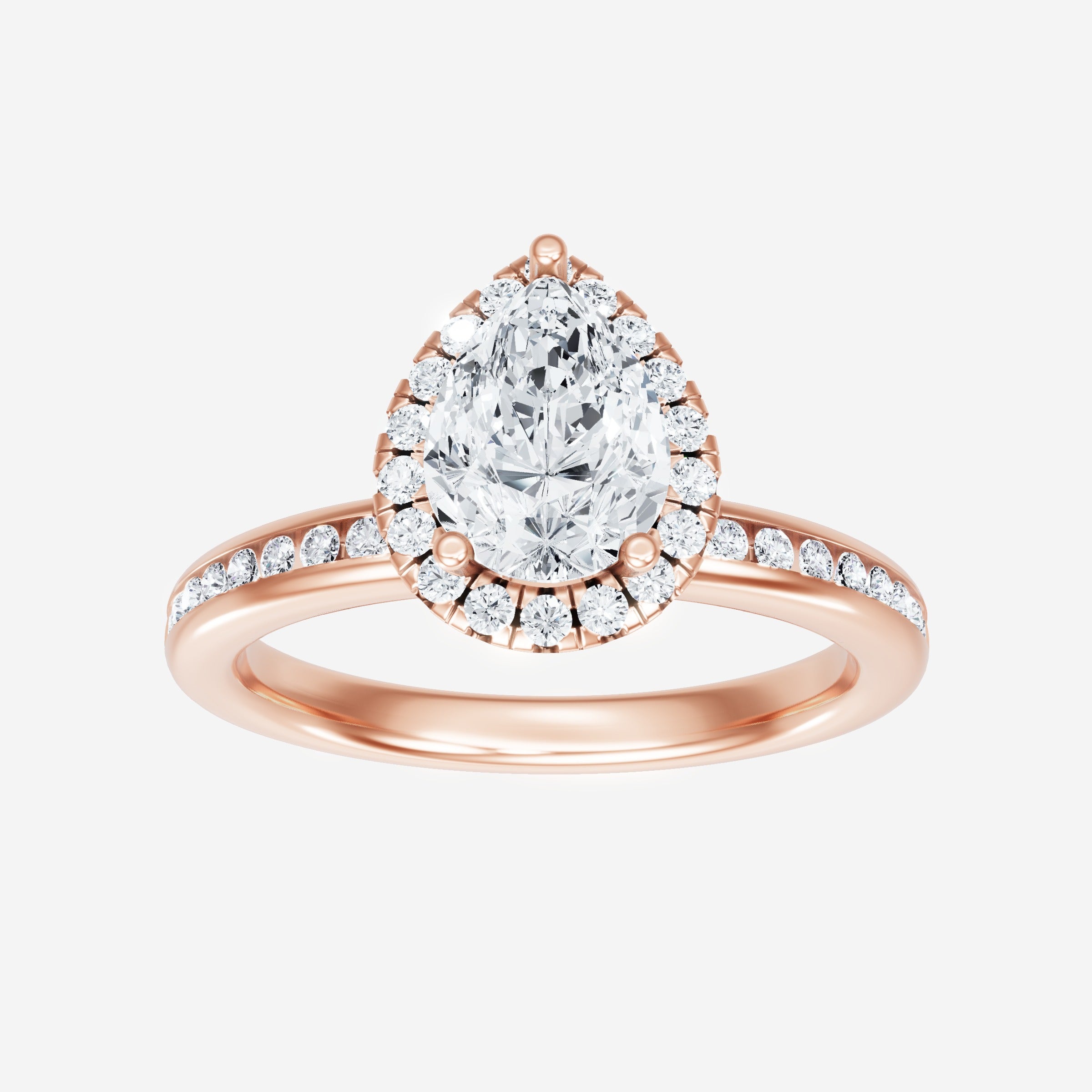 You’ve designed a ring that reflects lasting elegance and grace! Crafted from 14k Rose Gold, this exquisite Pear lab-grown diamond is the centerpiece of this unique design. This Channel Set Shank with a Micro Halo head showcases the brilliance of the Pear diamond, creating a timeless look. This elegant piece is the perfect symbol of love, strength, and timeless beauty.