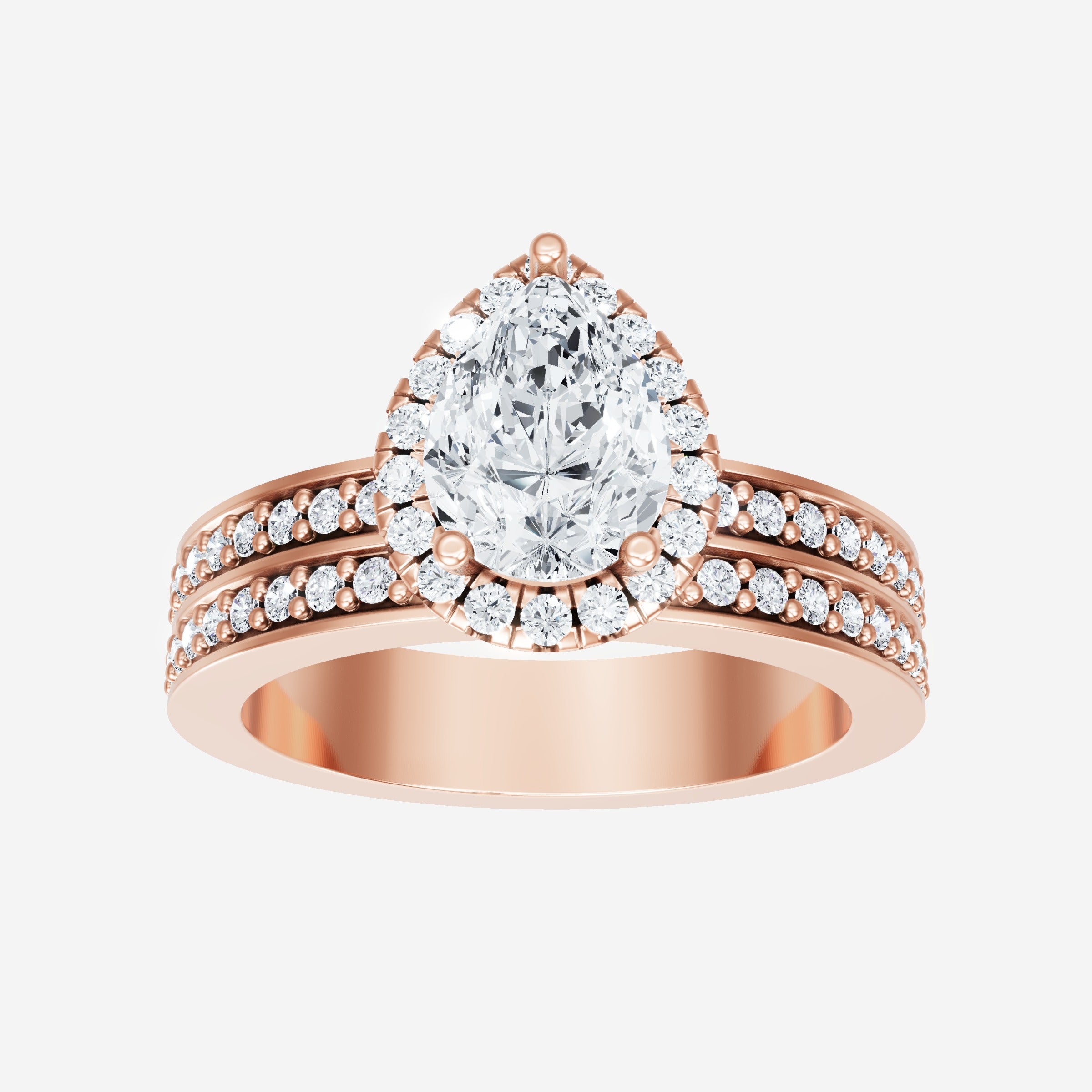 You’ve designed a ring that reflects lasting elegance and grace! Crafted from 14k Rose Gold, this exquisite Pear lab-grown diamond is the centerpiece of this unique design. This Double Row Pave with a Micro Halo head showcases the brilliance of the Pear diamond, creating a timeless look. This ring will become a cherished reminder of life's most treasured moments.