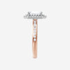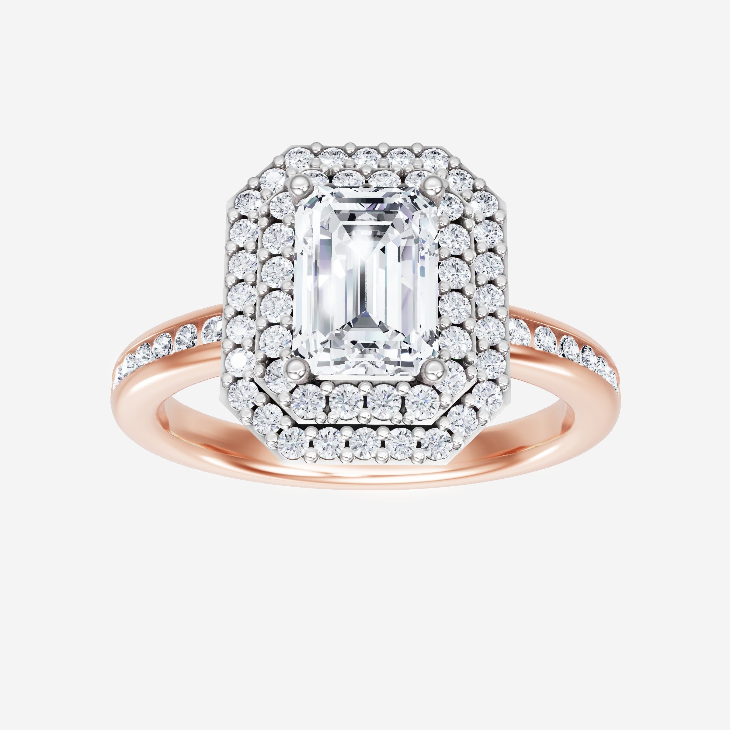 You’ve designed a ring that reflects lasting elegance and grace! Crafted from 14k Rose White Dual Tone, this exquisite Emerald lab-grown diamond is the centerpiece of this unique design. This Channel Set Shank with a Double Halo head showcases the brilliance of the Emerald diamond, creating a timeless look. This ring will become a cherished reminder of life's most treasured moments.