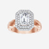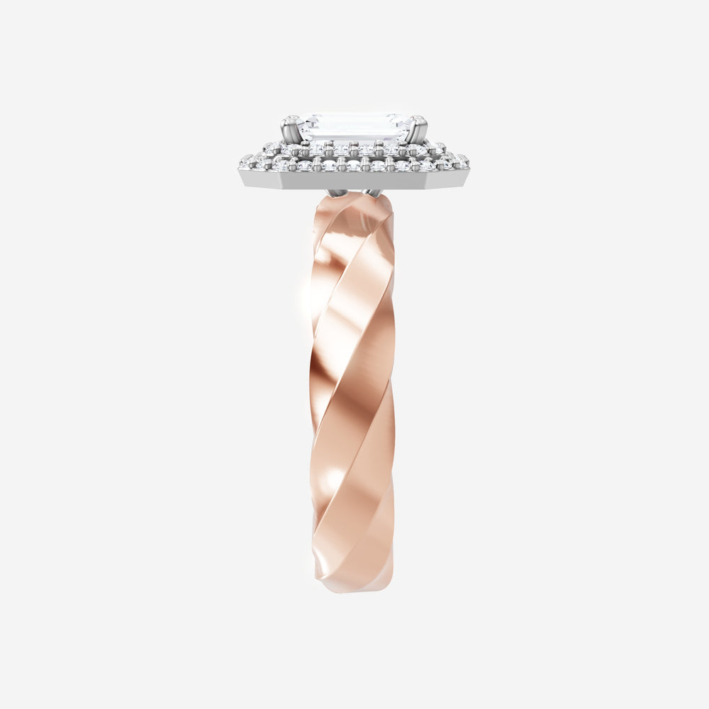 You’ve designed a ring that reflects lasting elegance and grace! Crafted from 14k Rose White Dual Tone, this exquisite Emerald lab-grown diamond is the centerpiece of this unique design. This Twisted Shank with a Double Halo head showcases the brilliance of the Emerald diamond, creating a timeless look. A perfect choice to celebrate love, commitment, and everything in between.