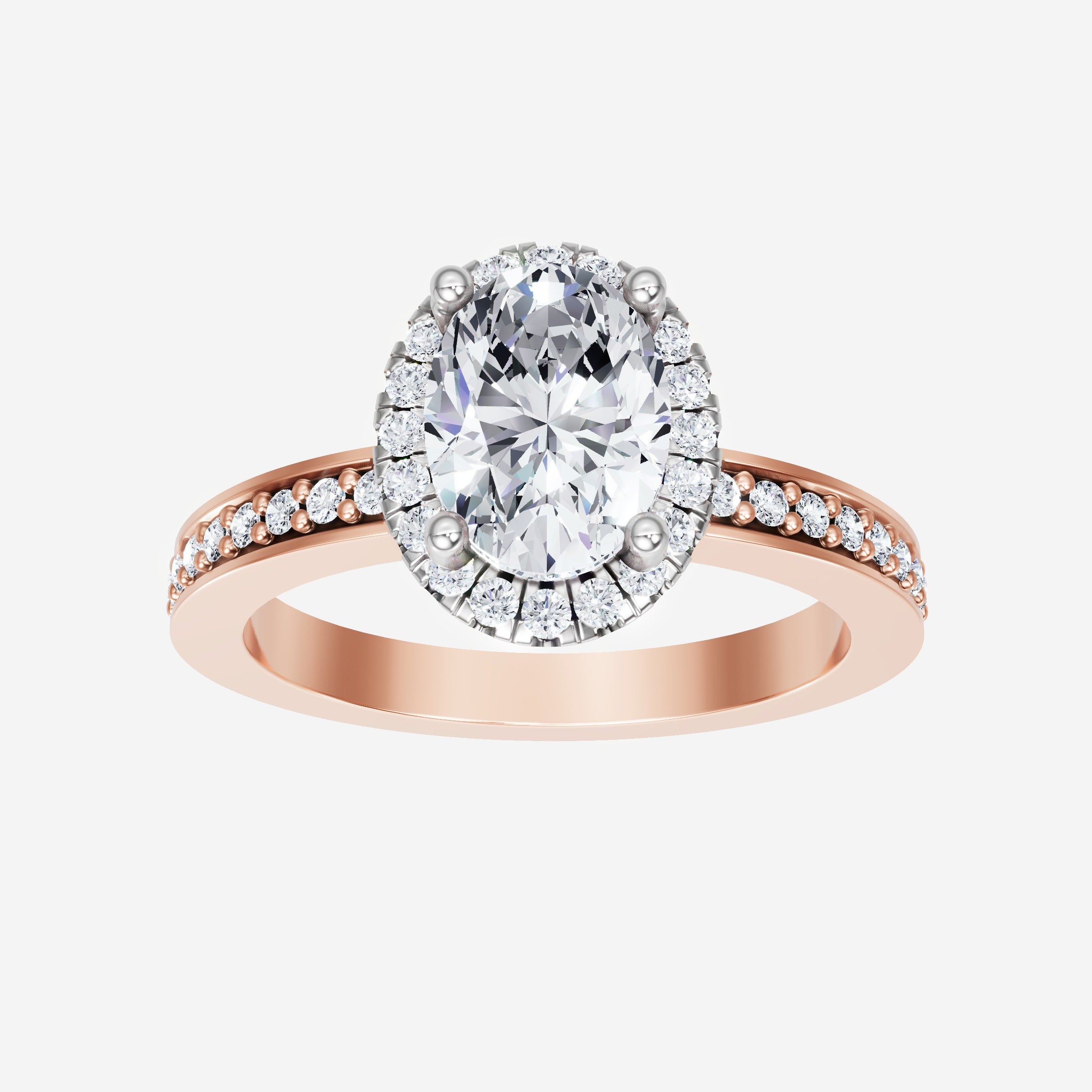 You’ve designed a ring that reflects lasting elegance and grace! Crafted from 14k Rose White Dual Tone, this exquisite Oval lab-grown diamond is the centerpiece of this unique design. This Single Pave Shank with a Micro Halo head showcases the brilliance of the Oval diamond, creating a timeless look. This stunning ring makes the perfect symbol of everlasting love and devotion.