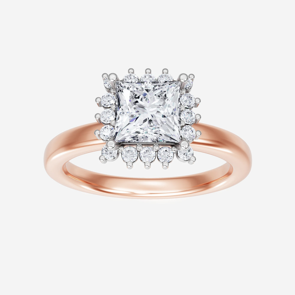 You’ve designed a ring that reflects lasting elegance and grace! Crafted from 14k Rose White Dual Tone, this exquisite Princess lab-grown diamond is the centerpiece of this unique design. This Basic Plain Shank with a Diana Halo head showcases the brilliance of the Princess diamond, creating a timeless look. This ring will become a cherished reminder of life's most treasured moments.