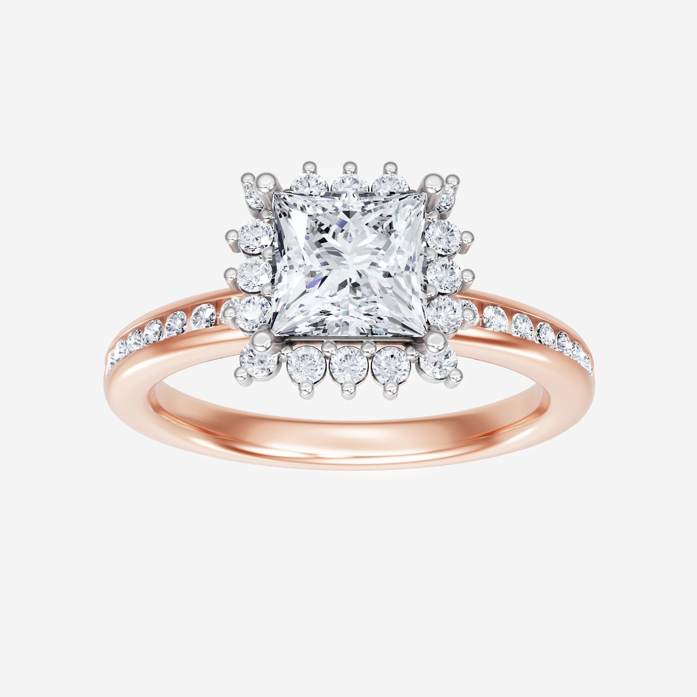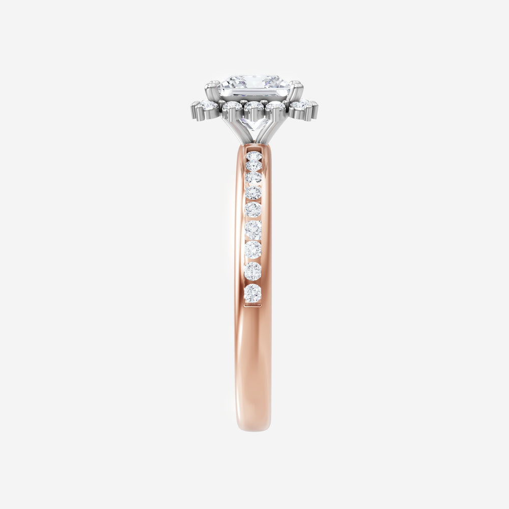 You’ve designed a ring that reflects lasting elegance and grace! Crafted from 14k Rose White Dual Tone, this exquisite Princess lab-grown diamond is the centerpiece of this unique design. This Channel Set Shank with a Diana Halo head showcases the brilliance of the Princess diamond, creating a timeless look. This elegant piece is the perfect symbol of love, strength, and timeless beauty.