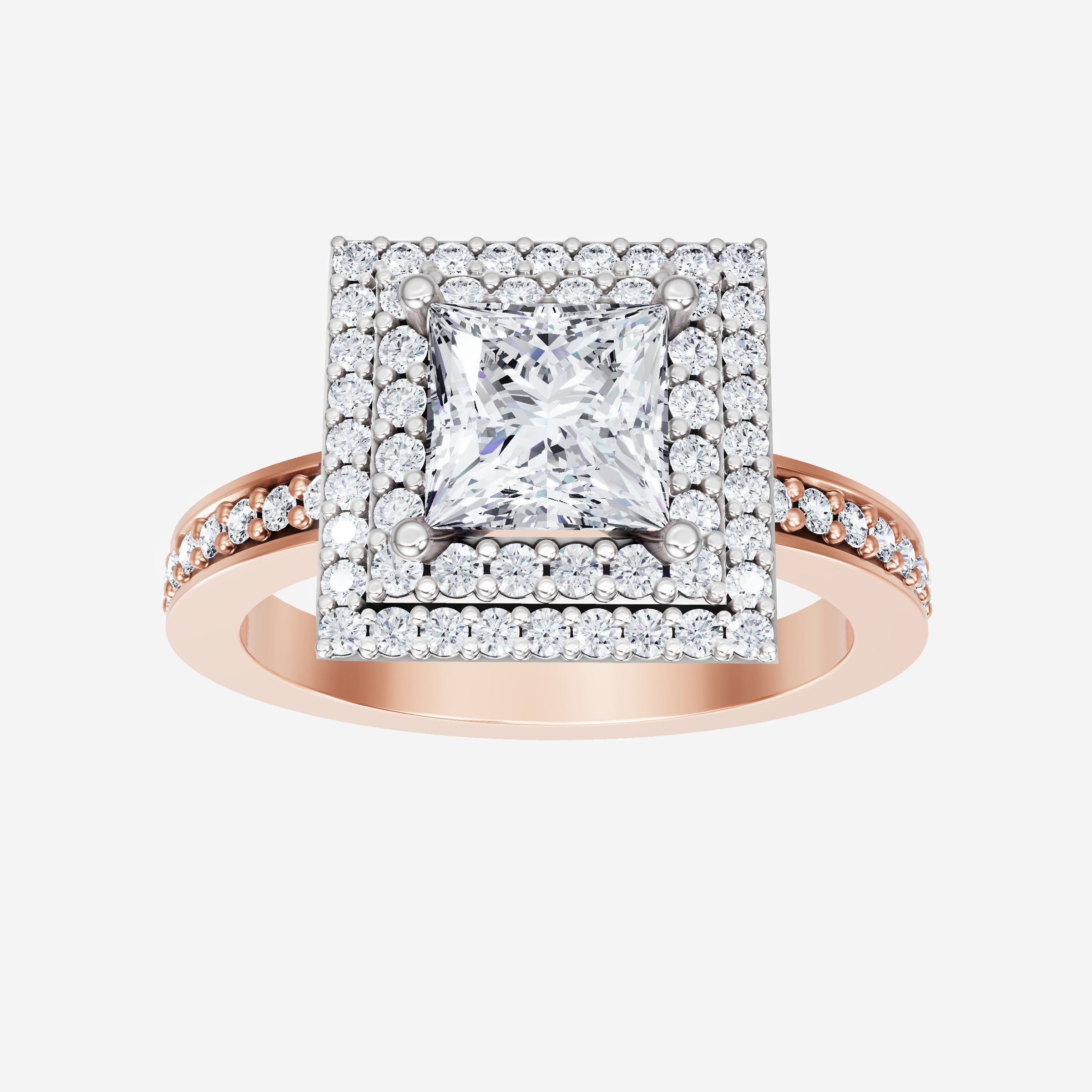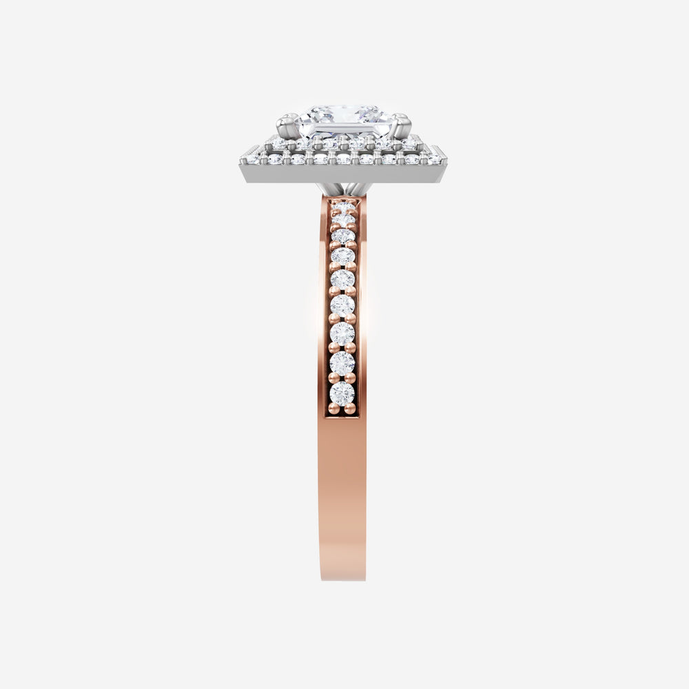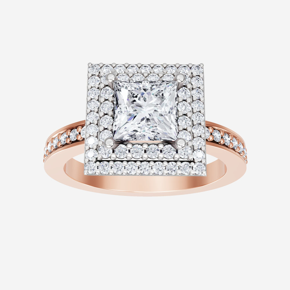 You’ve designed a ring that reflects lasting elegance and grace! Crafted from 14k Rose White Dual Tone, this exquisite Princess lab-grown diamond is the centerpiece of this unique design. This Single Pave Shank with a Double Halo head showcases the brilliance of the Princess diamond, creating a timeless look. A perfect choice to celebrate love, commitment, and everything in between.