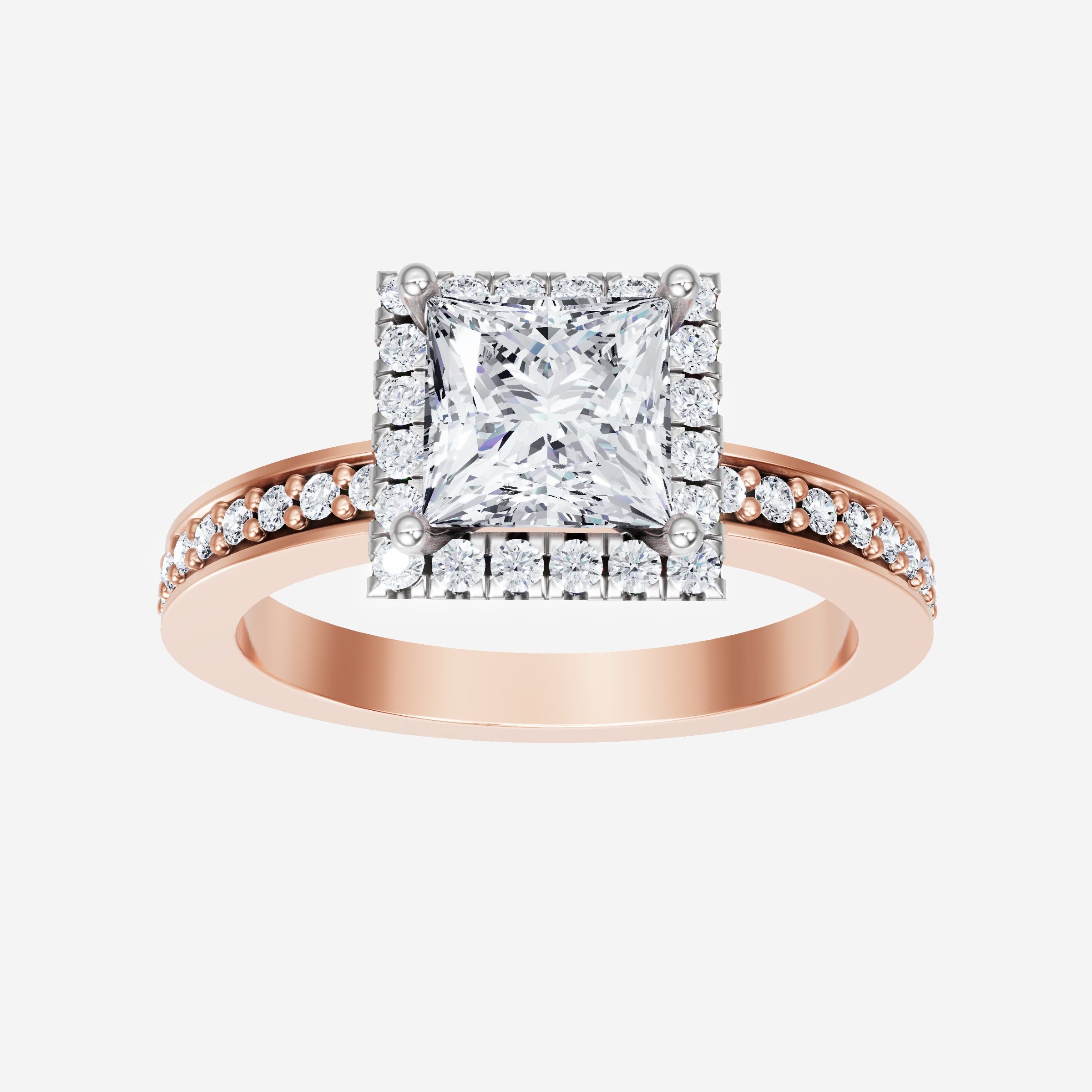 You’ve designed a ring that reflects lasting elegance and grace! Crafted from 14k Rose White Dual Tone, this exquisite Princess lab-grown diamond is the centerpiece of this unique design. This Single Pave Shank with a Micro Halo head showcases the brilliance of the Princess diamond, creating a timeless look. This stunning ring makes the perfect symbol of everlasting love and devotion.