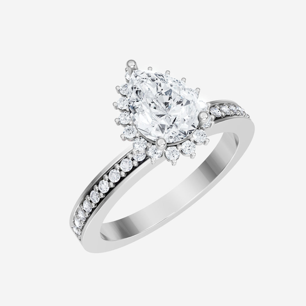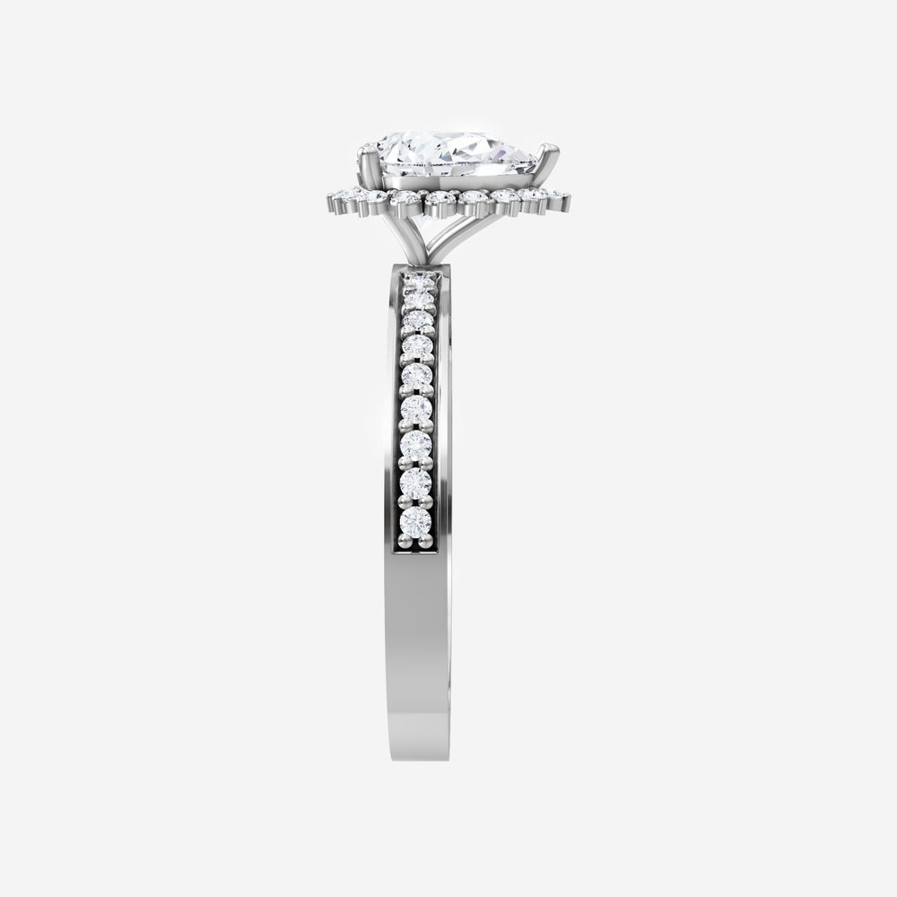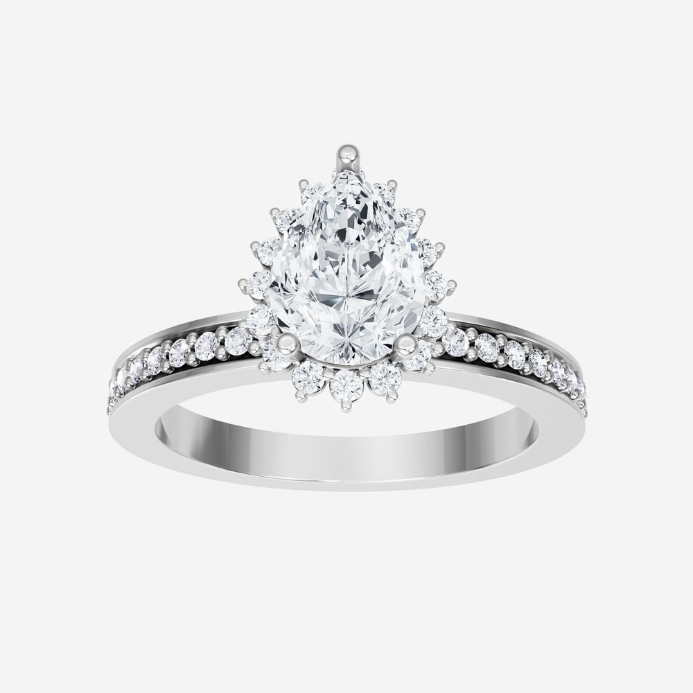 You’ve designed a ring that reflects lasting elegance and grace! Crafted from 14k White Gold, this exquisite Pear lab-grown diamond is the centerpiece of this unique design. This Single Pave Shank with a Diana Halo head showcases the brilliance of the Pear diamond, creating a timeless look. This ring will become a cherished reminder of life's most treasured moments.