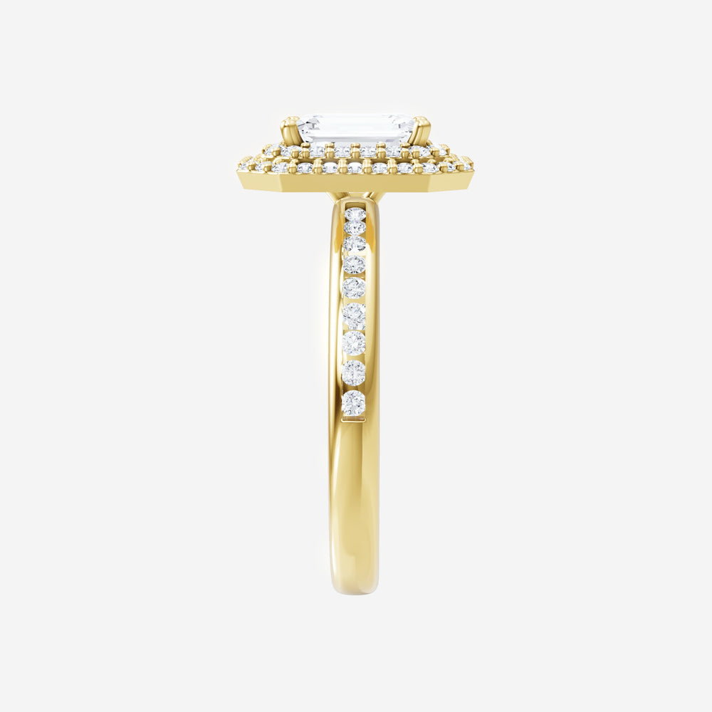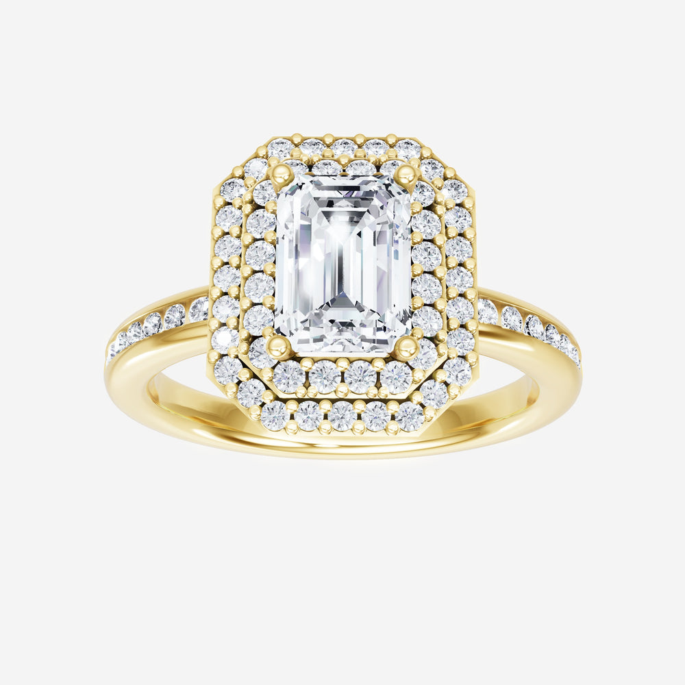 You’ve designed a ring that reflects lasting elegance and grace! Crafted from 14k Yellow Gold, this exquisite Emerald lab-grown diamond is the centerpiece of this unique design. This Channel Set Shank with a Double Halo head showcases the brilliance of the Emerald diamond, creating a timeless look. Ideal for those who seek both beauty and meaning, this ring will stand as a testament to cherished memories.
