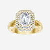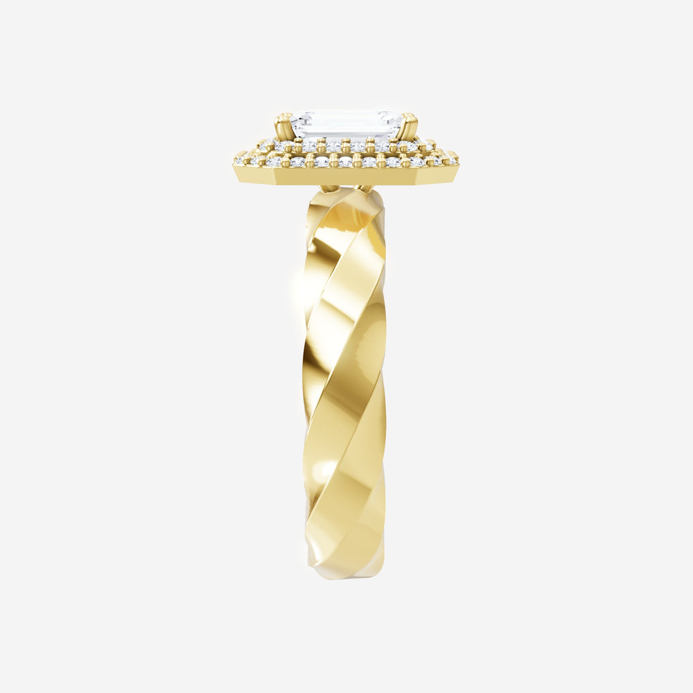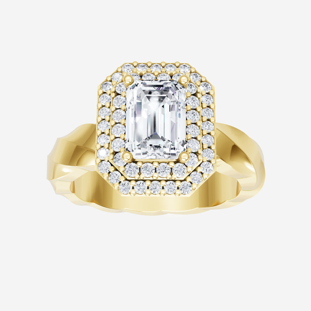 You’ve designed a ring that reflects lasting elegance and grace! Crafted from 14k Yellow Gold, this exquisite Emerald lab-grown diamond is the centerpiece of this unique design. This Twisted Shank with a Double Halo head showcases the brilliance of the Emerald diamond, creating a timeless look. This stunning ring makes the perfect symbol of everlasting love and devotion.