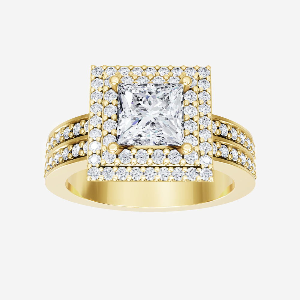 You’ve designed a ring that reflects lasting elegance and grace! Crafted from 14k Yellow Gold, this exquisite Princess lab-grown diamond is the centerpiece of this unique design. This Double Row Pave with a Double Halo head showcases the brilliance of the Princess diamond, creating a timeless look. Ideal for those who seek both beauty and meaning, this ring will stand as a testament to cherished memories.