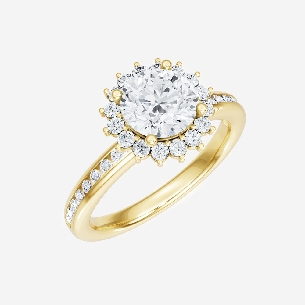 You’ve designed a ring that reflects lasting elegance and grace! Crafted from 14k Yellow Gold, this exquisite Round lab-grown diamond is the centerpiece of this unique design. This Channel Set Shank with a Diana Halo head showcases the brilliance of the Round diamond, creating a timeless look. Ideal for those who seek both beauty and meaning, this ring will stand as a testament to cherished memories.