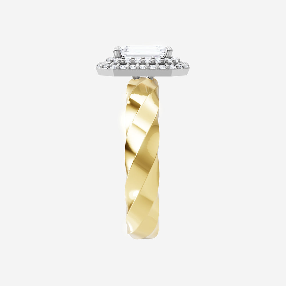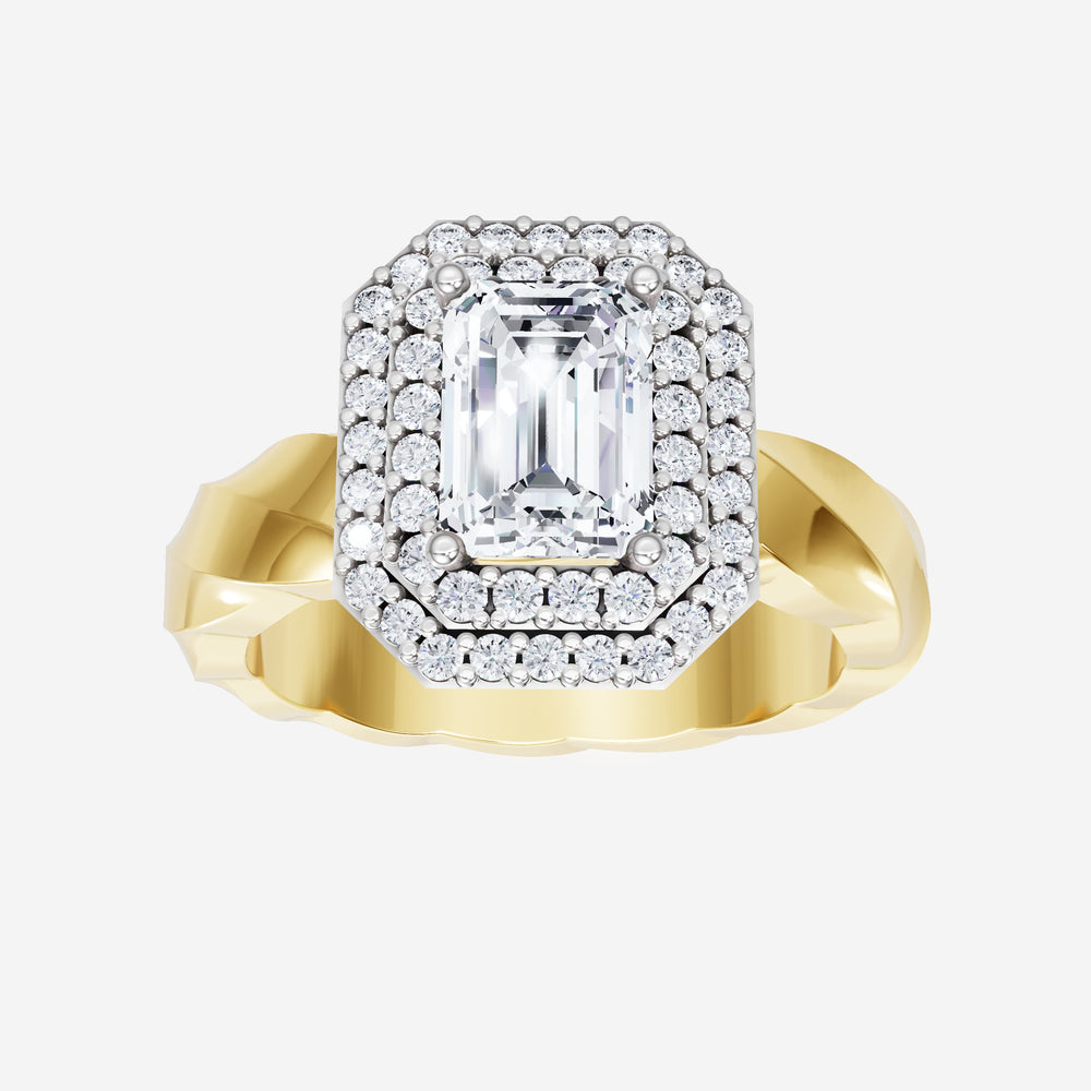 You’ve designed a ring that reflects lasting elegance and grace! Crafted from 14k Yellow White Dual Tone, this exquisite Emerald lab-grown diamond is the centerpiece of this unique design. This Twisted Shank with a Double Halo head showcases the brilliance of the Emerald diamond, creating a timeless look. It's a piece of elegance and beauty, perfect for marking life's most beautiful occasions.