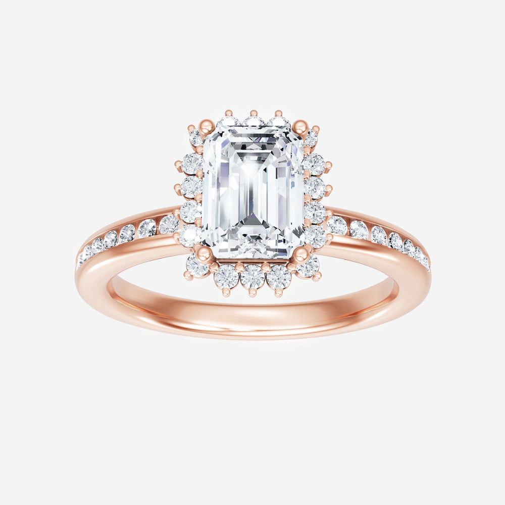 You’ve designed a ring that reflects lasting elegance and grace! Crafted from 18k Rose Gold, this exquisite Emerald lab-grown diamond is the centerpiece of this unique design. This Channel Set Shank with a Diana Halo head showcases the brilliance of the Emerald diamond, creating a timeless look. This stunning ring makes the perfect symbol of everlasting love and devotion.