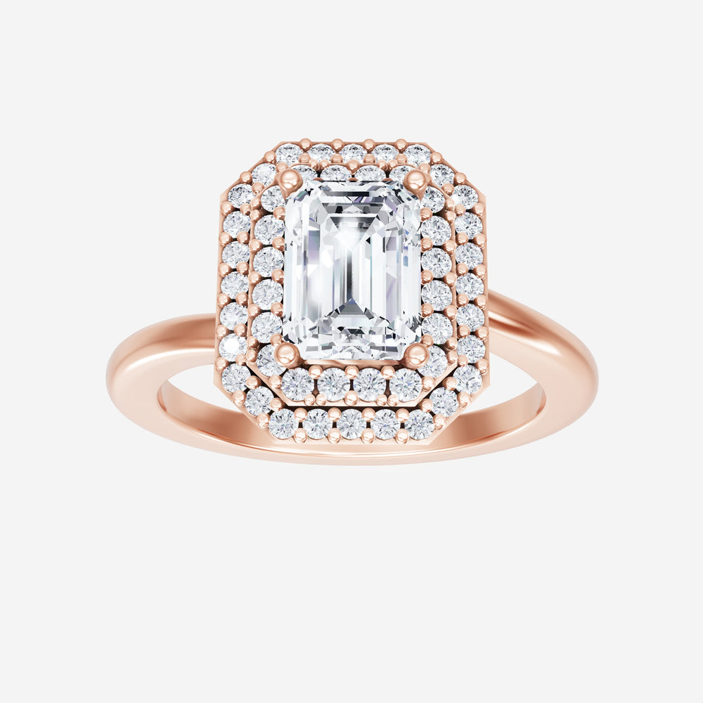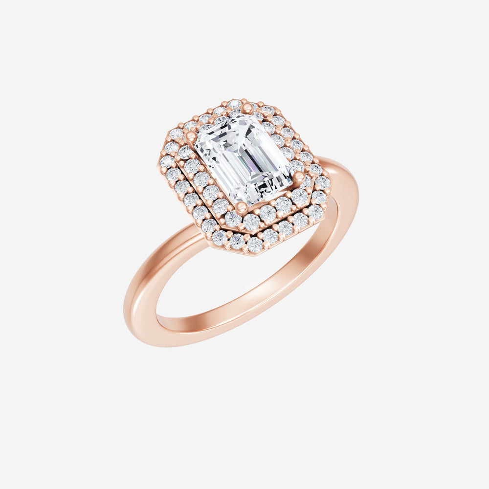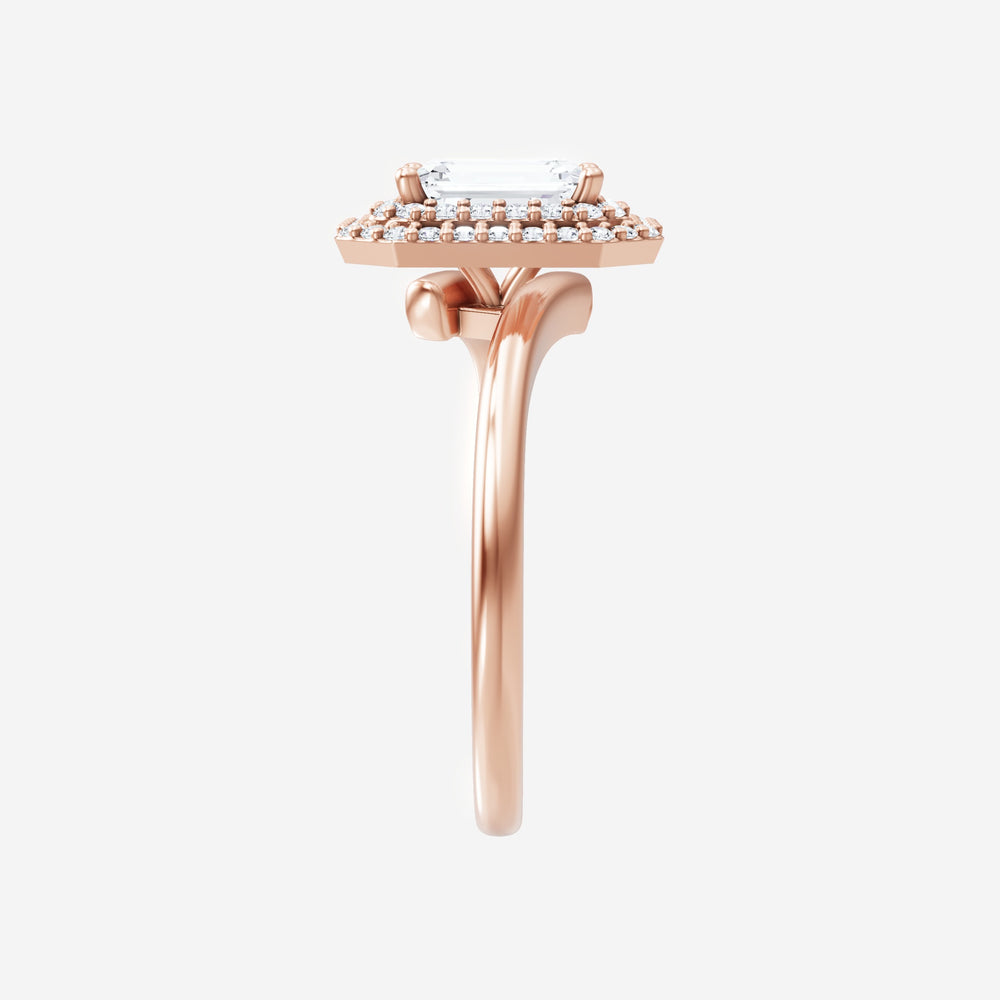 You’ve designed a ring that reflects lasting elegance and grace! Crafted from 18k Rose Gold, this exquisite Emerald lab-grown diamond is the centerpiece of this unique design. This Bypass Shank with a Double Halo head showcases the brilliance of the Emerald diamond, creating a timeless look. With this ring, celebrate every moment of joy, success, and love.