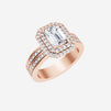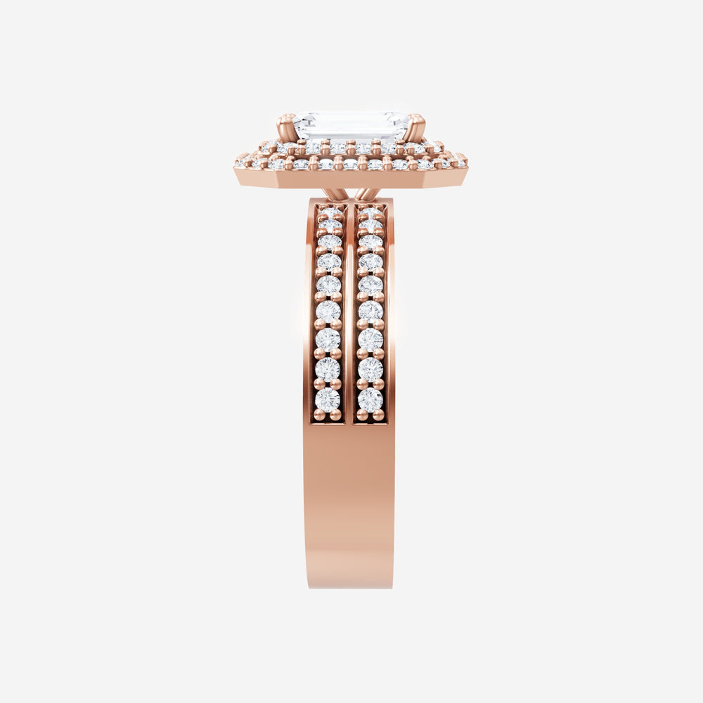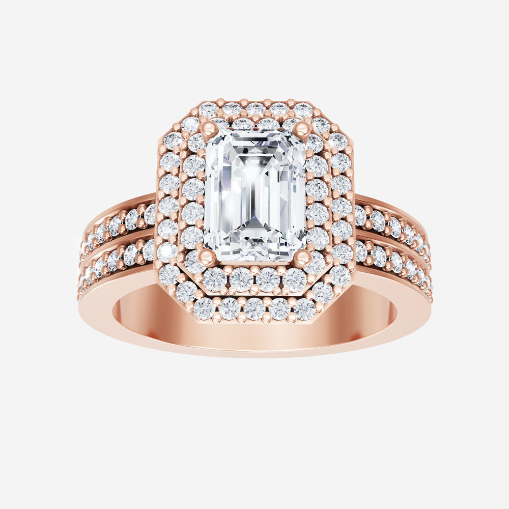 You’ve designed a ring that reflects lasting elegance and grace! Crafted from 18k Rose Gold, this exquisite Emerald lab-grown diamond is the centerpiece of this unique design. This Double Row Pave with a Double Halo head showcases the brilliance of the Emerald diamond, creating a timeless look. A perfect choice to celebrate love, commitment, and everything in between.