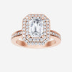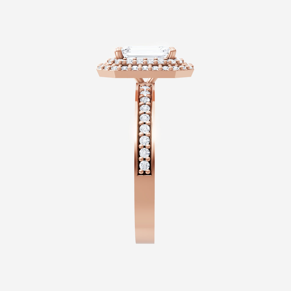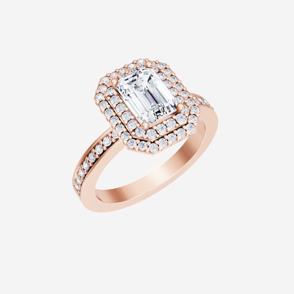 You’ve designed a ring that reflects lasting elegance and grace! Crafted from 18k Rose Gold, this exquisite Emerald lab-grown diamond is the centerpiece of this unique design. This Single Pave Shank with a Double Halo head showcases the brilliance of the Emerald diamond, creating a timeless look. A perfect choice to celebrate love, commitment, and everything in between.