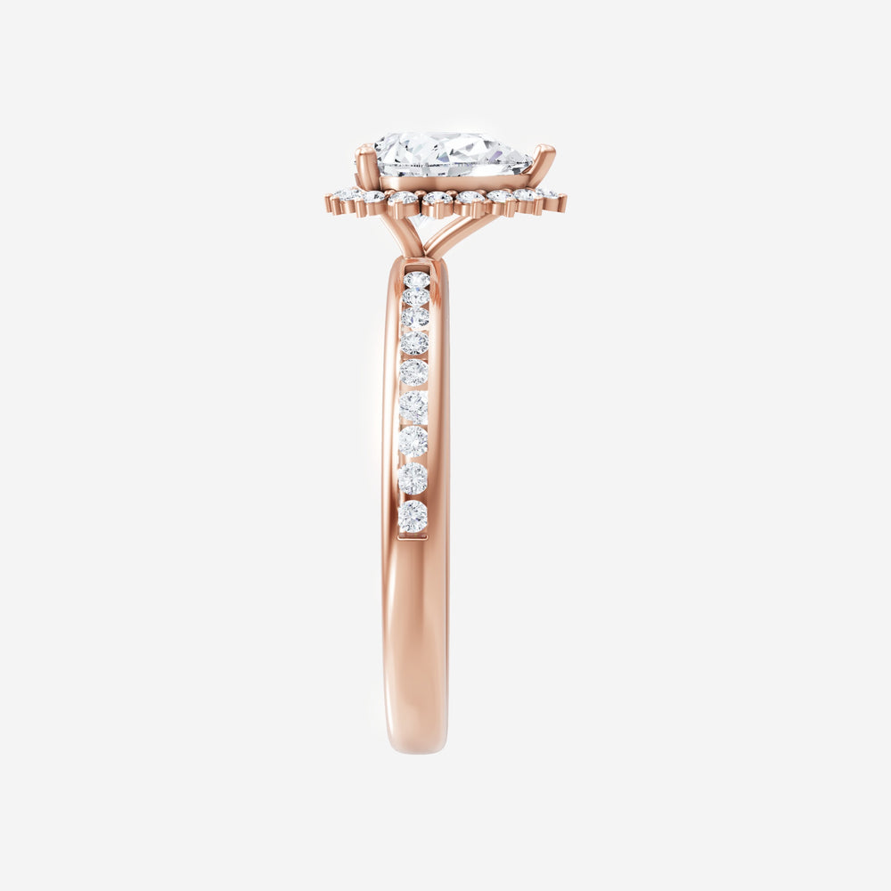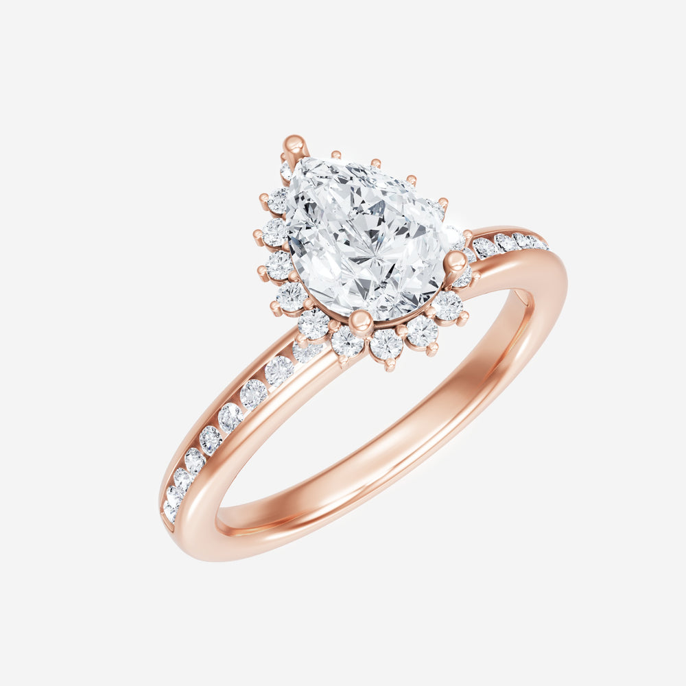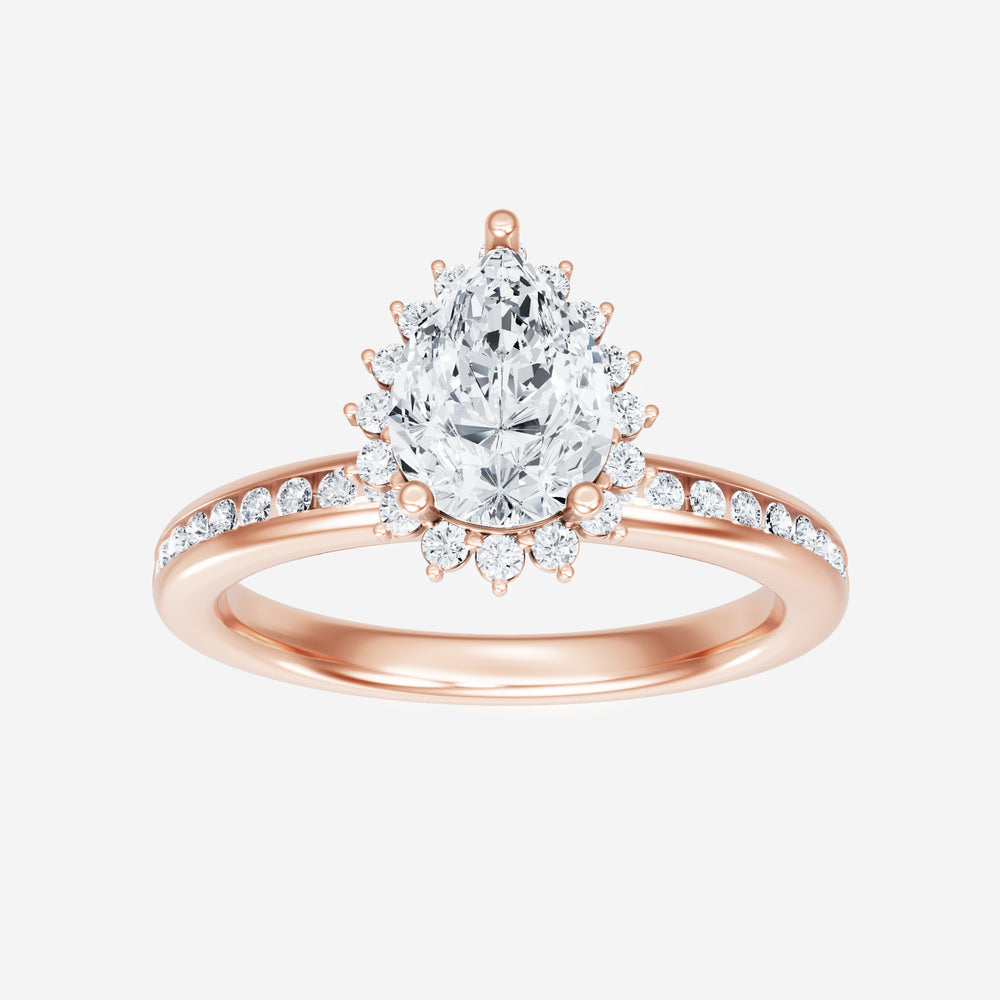 You’ve designed a ring that reflects lasting elegance and grace! Crafted from 18k Rose Gold, this exquisite Pear lab-grown diamond is the centerpiece of this unique design. This Channel Set Shank with a Diana Halo head showcases the brilliance of the Pear diamond, creating a timeless look. This stunning ring makes the perfect symbol of everlasting love and devotion.