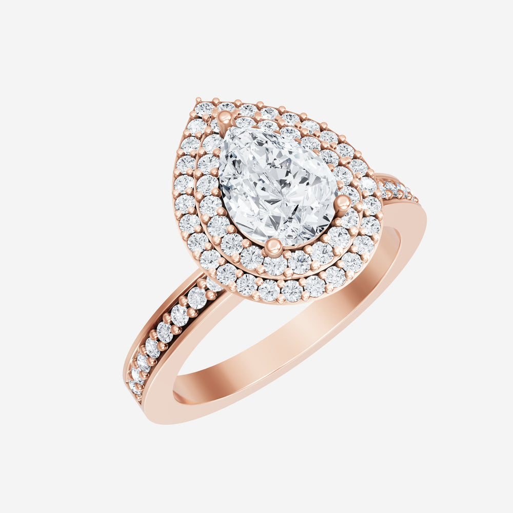 You’ve designed a ring that reflects lasting elegance and grace! Crafted from 18k Rose Gold, this exquisite Pear lab-grown diamond is the centerpiece of this unique design. This Single Pave Shank with a Double Halo head showcases the brilliance of the Pear diamond, creating a timeless look. This ring will become a cherished reminder of life's most treasured moments.