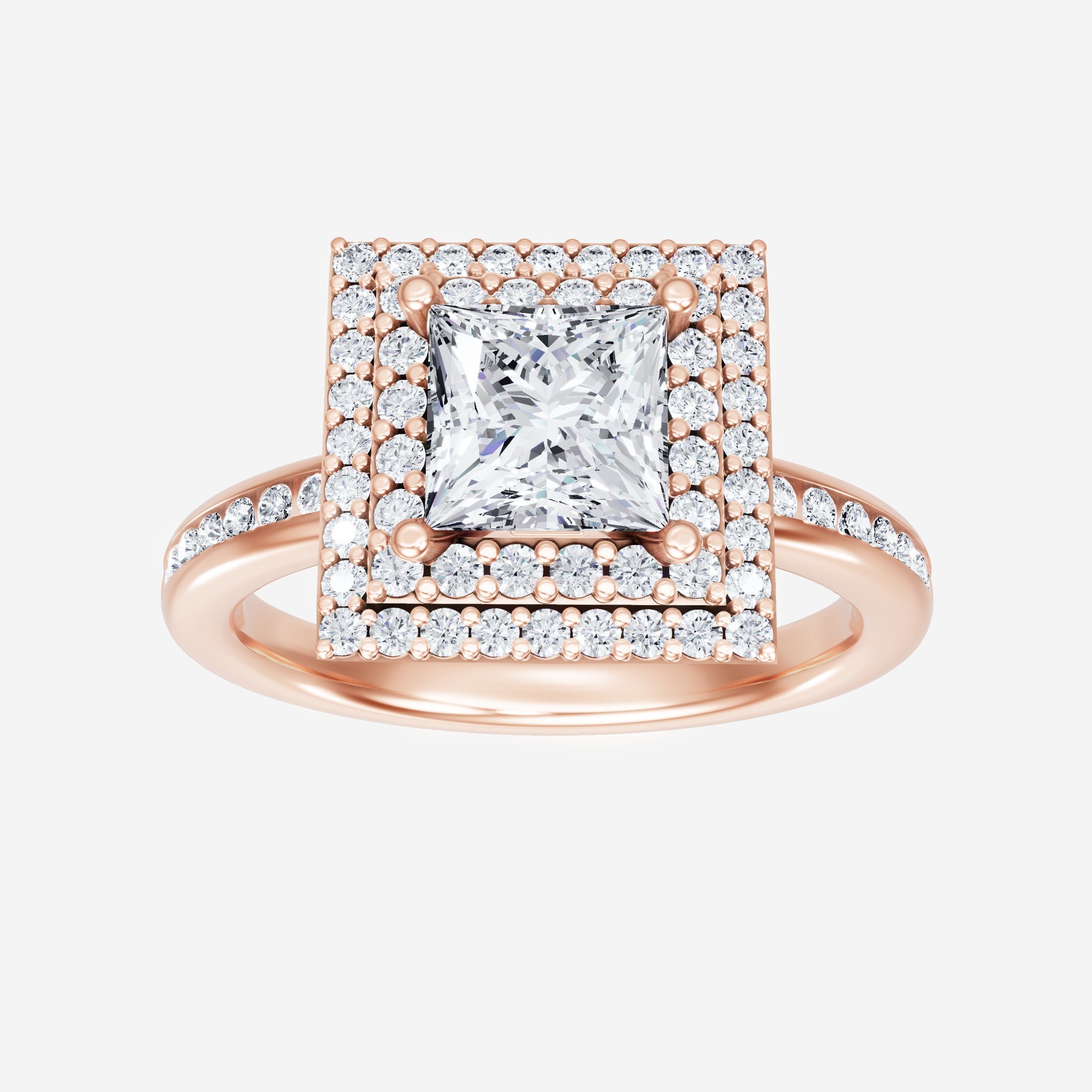You’ve designed a ring that reflects lasting elegance and grace! Crafted from 18k Rose Gold, this exquisite Princess lab-grown diamond is the centerpiece of this unique design. This Channel Set Shank with a Double Halo head showcases the brilliance of the Princess diamond, creating a timeless look. It's a piece of elegance and beauty, perfect for marking life's most beautiful occasions.