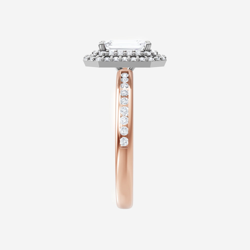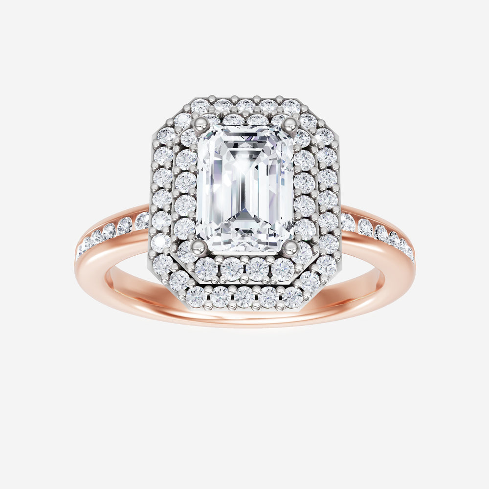 You’ve designed a ring that reflects lasting elegance and grace! Crafted from 18k Rose White Dual Tone, this exquisite Emerald lab-grown diamond is the centerpiece of this unique design. This Channel Set Shank with a Double Halo head showcases the brilliance of the Emerald diamond, creating a timeless look. With this ring, celebrate every moment of joy, success, and love.