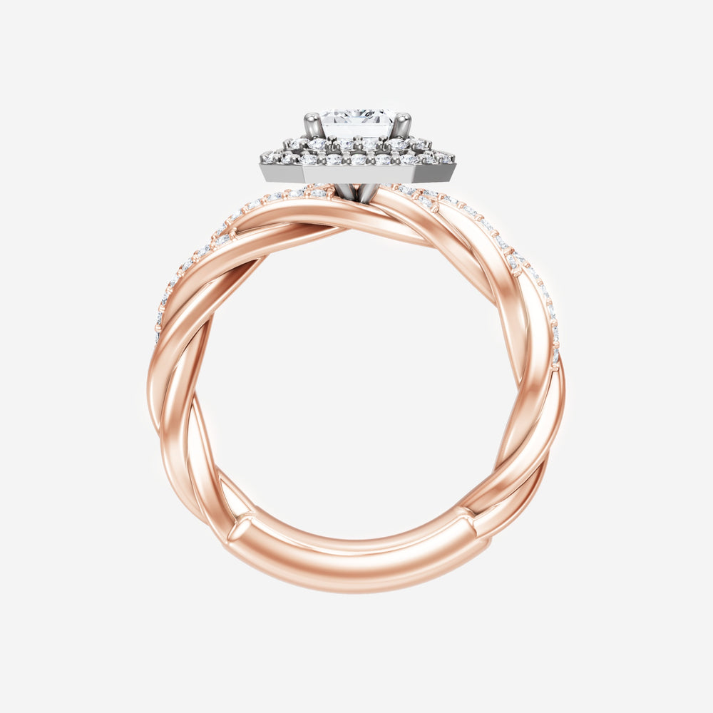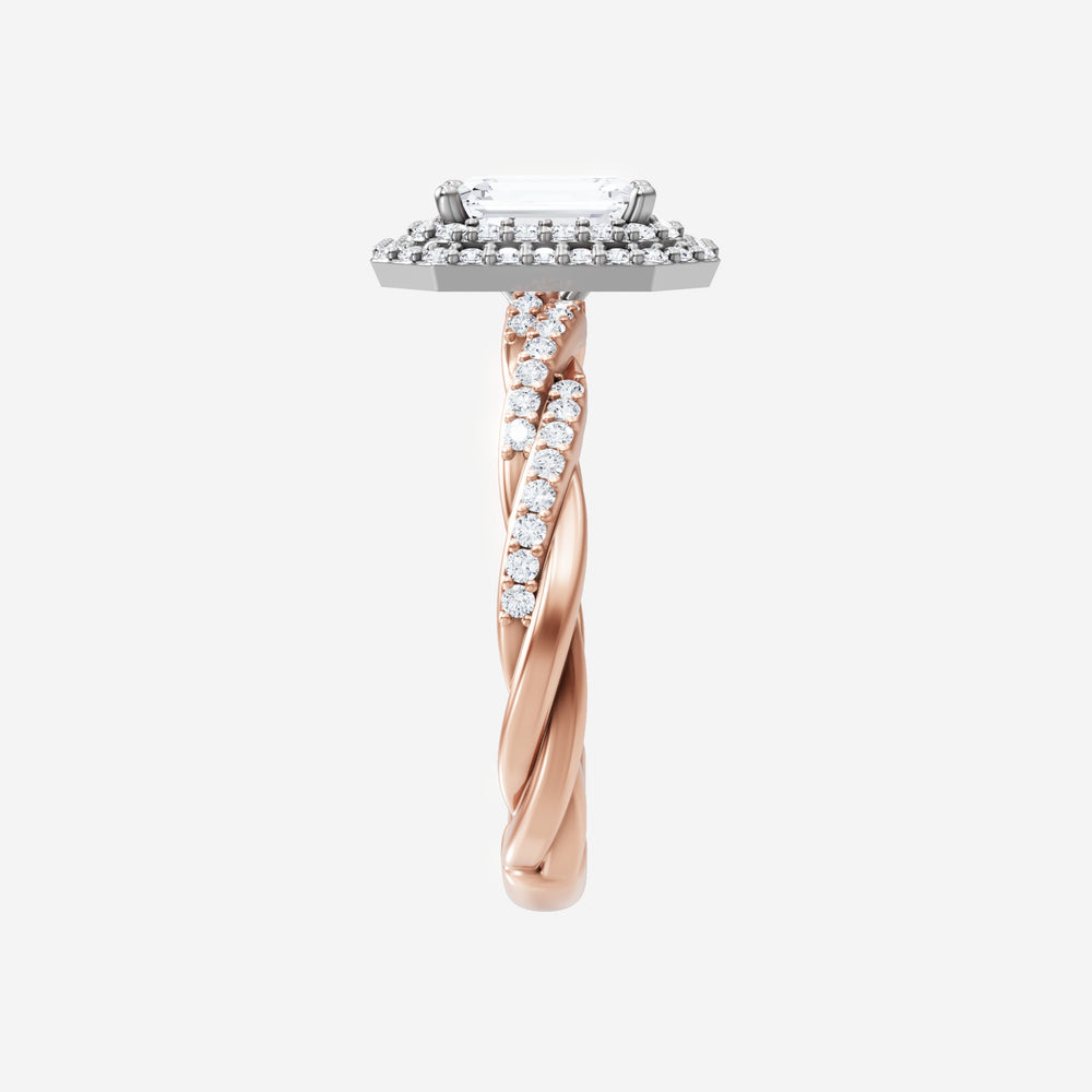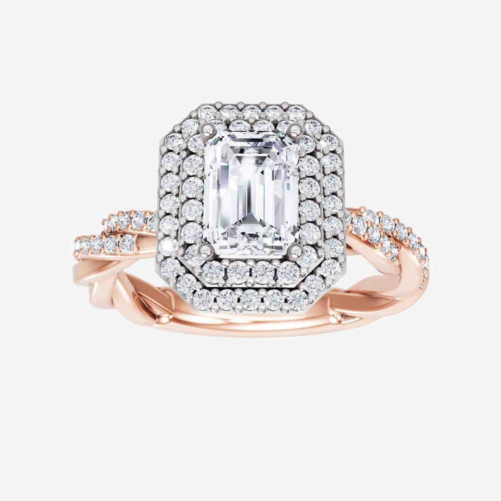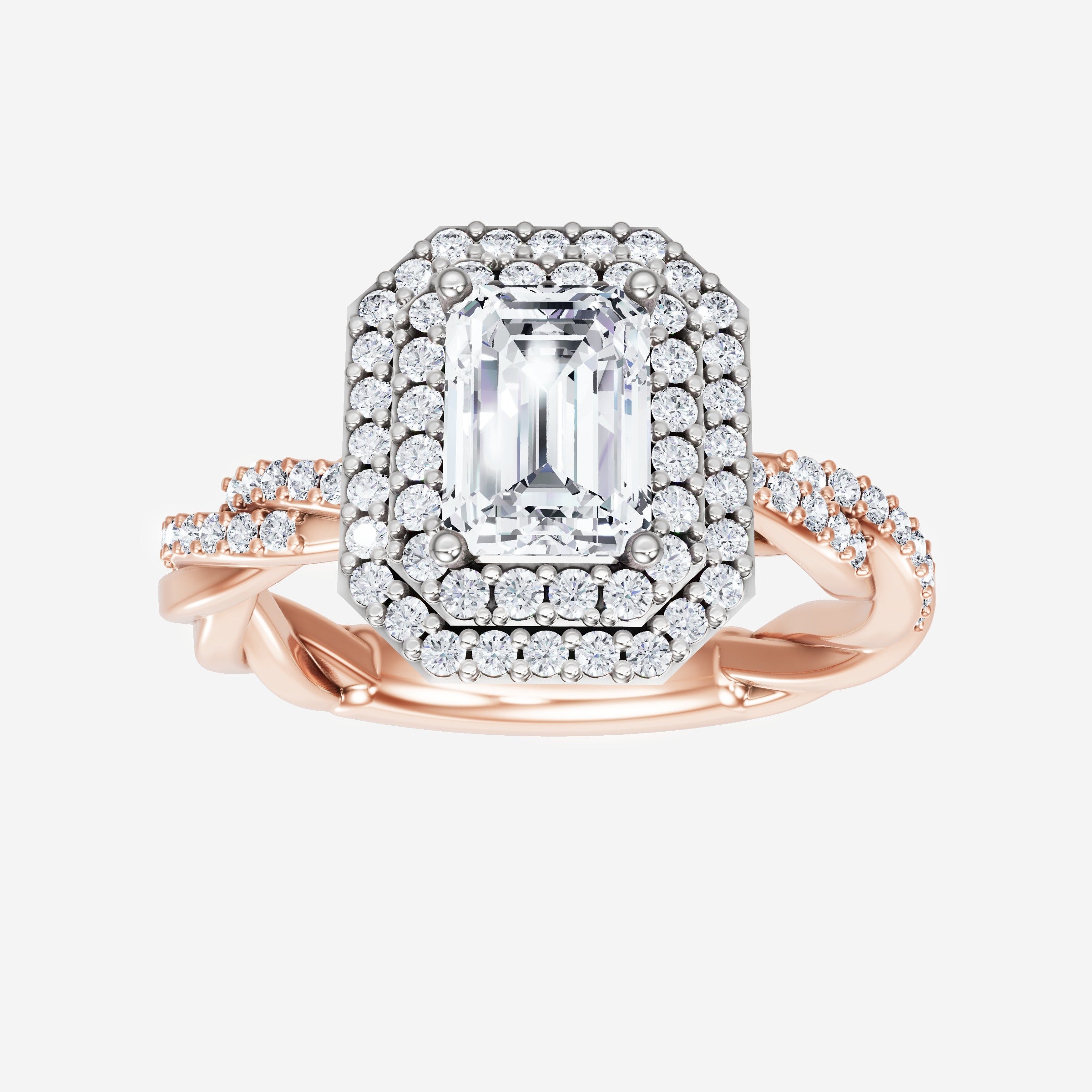 You’ve designed a ring that reflects lasting elegance and grace! Crafted from 18k Rose White Dual Tone, this exquisite Emerald lab-grown diamond is the centerpiece of this unique design. This Rope Diamond Shank with a Double Halo head showcases the brilliance of the Emerald diamond, creating a timeless look. This stunning ring makes the perfect symbol of everlasting love and devotion.