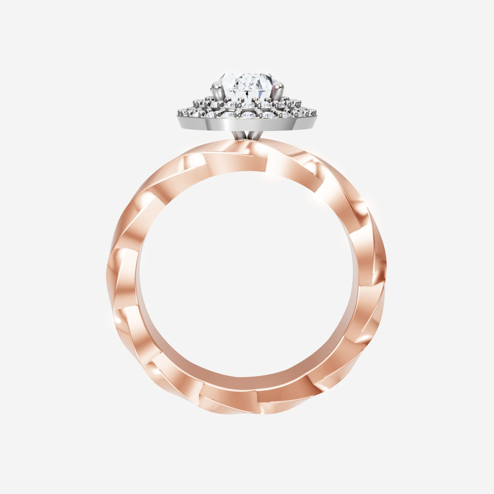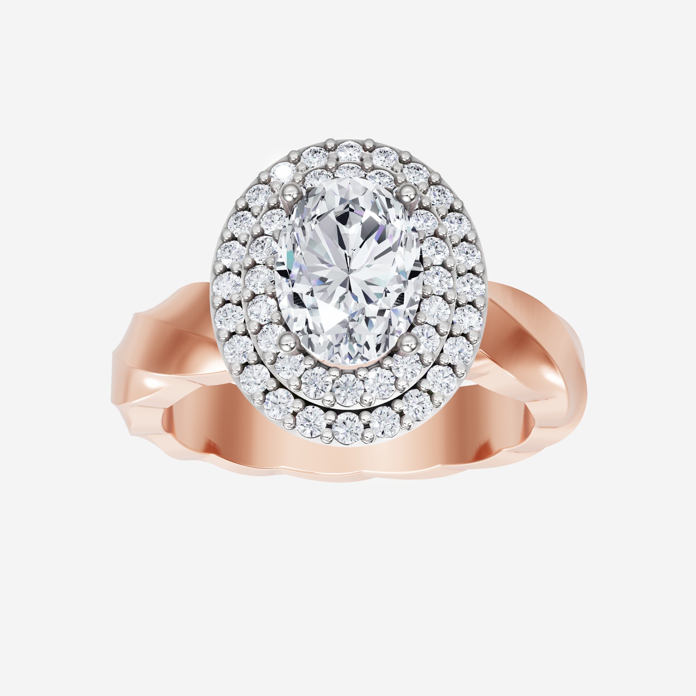 You’ve designed a ring that reflects lasting elegance and grace! Crafted from 18k Rose White Dual Tone, this exquisite Oval lab-grown diamond is the centerpiece of this unique design. This Twisted Shank with a Double Halo head showcases the brilliance of the Oval diamond, creating a timeless look. This elegant piece is the perfect symbol of love, strength, and timeless beauty.