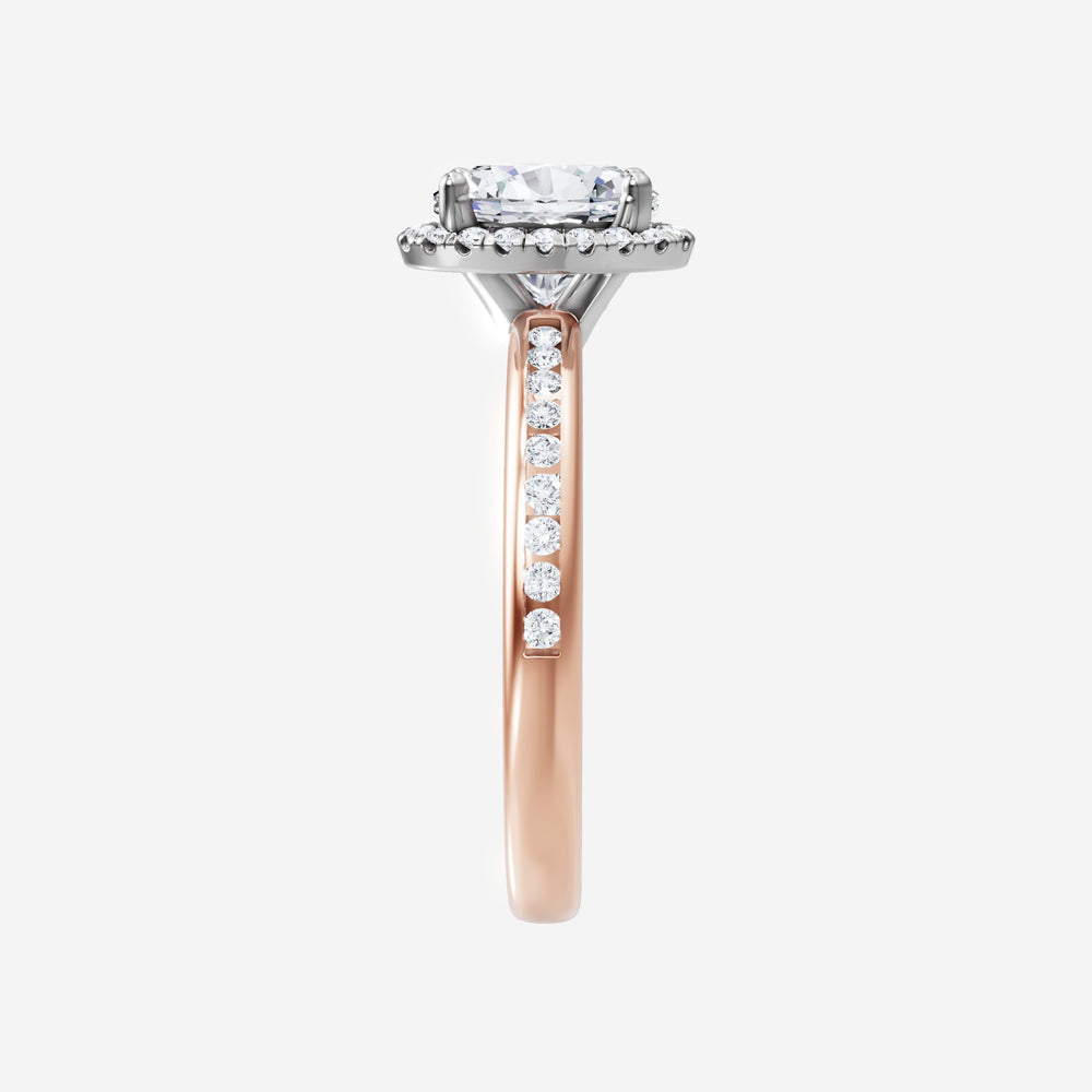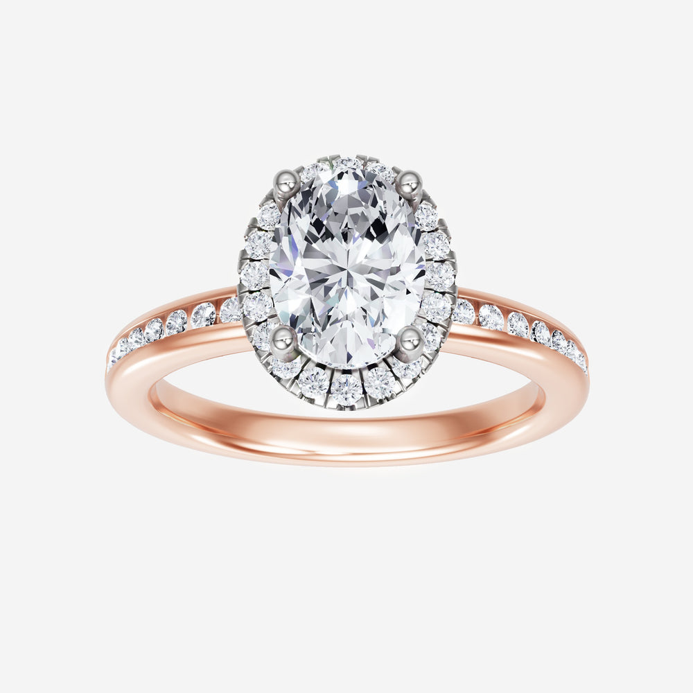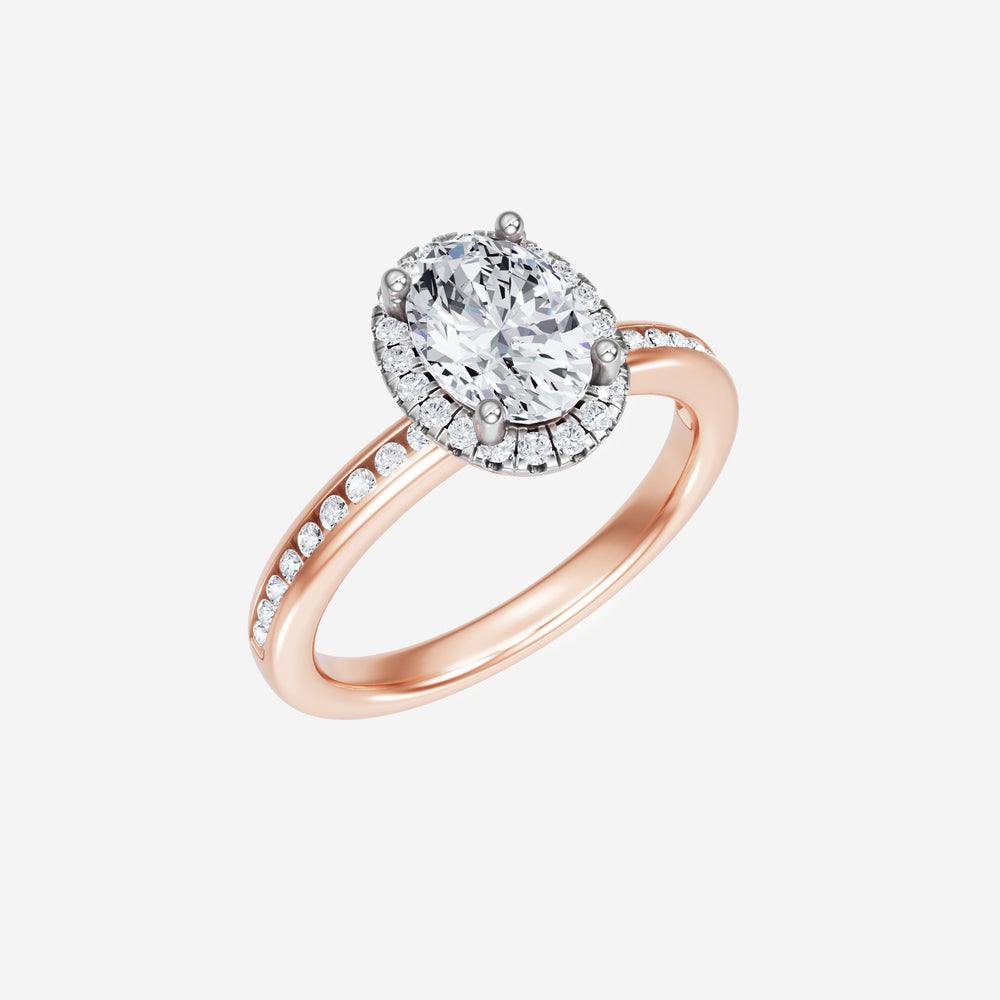 You’ve designed a ring that reflects lasting elegance and grace! Crafted from 18k Rose White Dual Tone, this exquisite Oval lab-grown diamond is the centerpiece of this unique design. This Channel Set Shank with a Micro Halo head showcases the brilliance of the Oval diamond, creating a timeless look. A perfect choice to celebrate love, commitment, and everything in between.