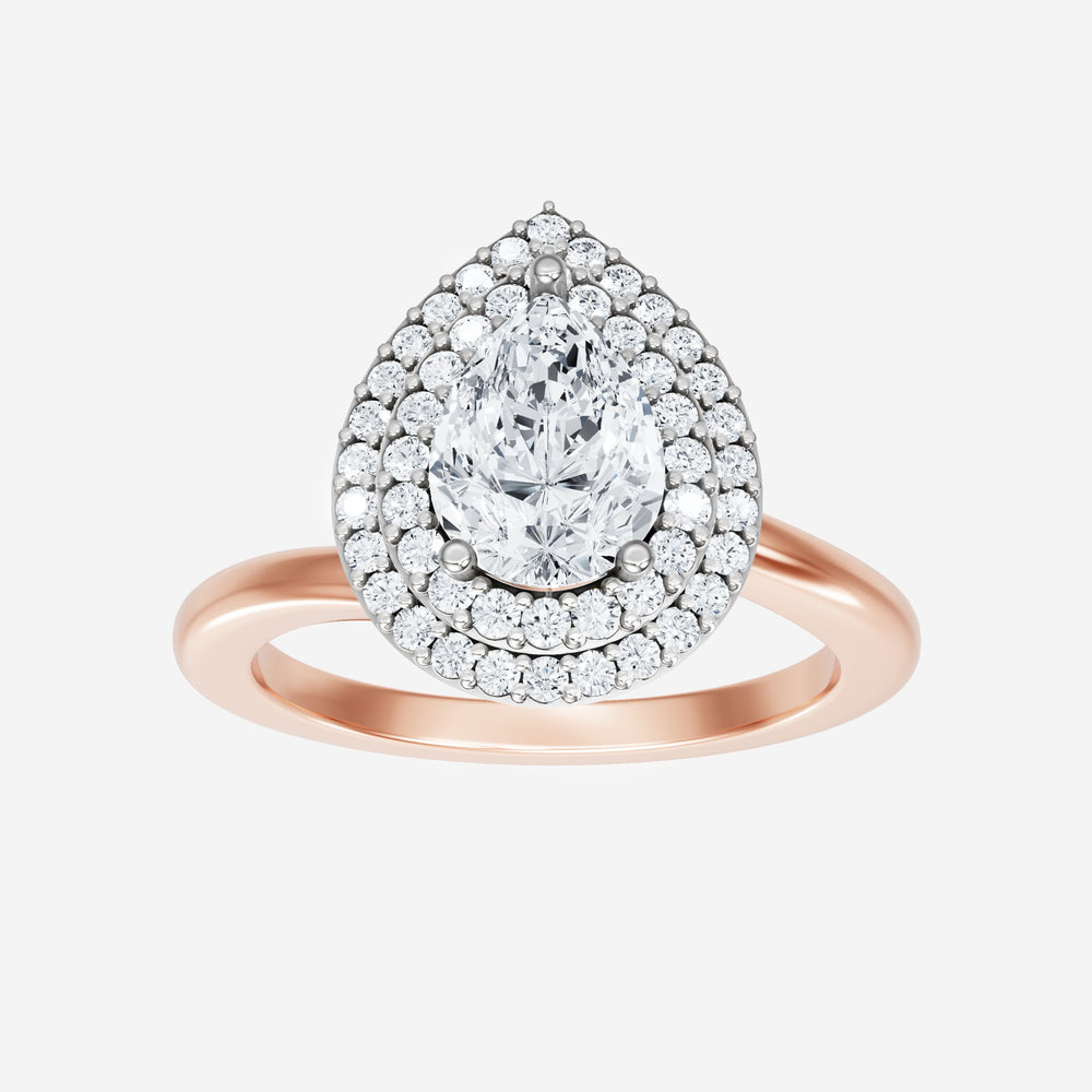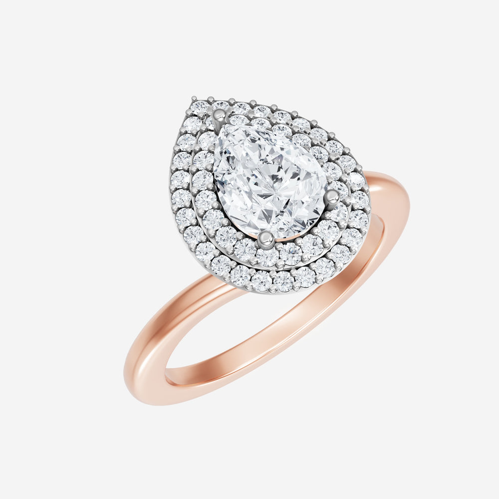 You’ve designed a ring that reflects lasting elegance and grace! Crafted from 18k Rose White Dual Tone, this exquisite Pear lab-grown diamond is the centerpiece of this unique design. This Bypass Shank with a Double Halo head showcases the brilliance of the Pear diamond, creating a timeless look. A perfect choice to celebrate love, commitment, and everything in between.