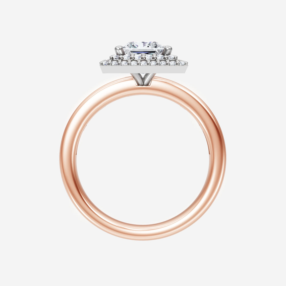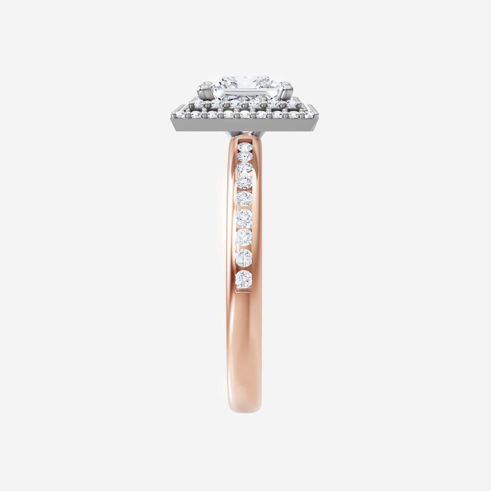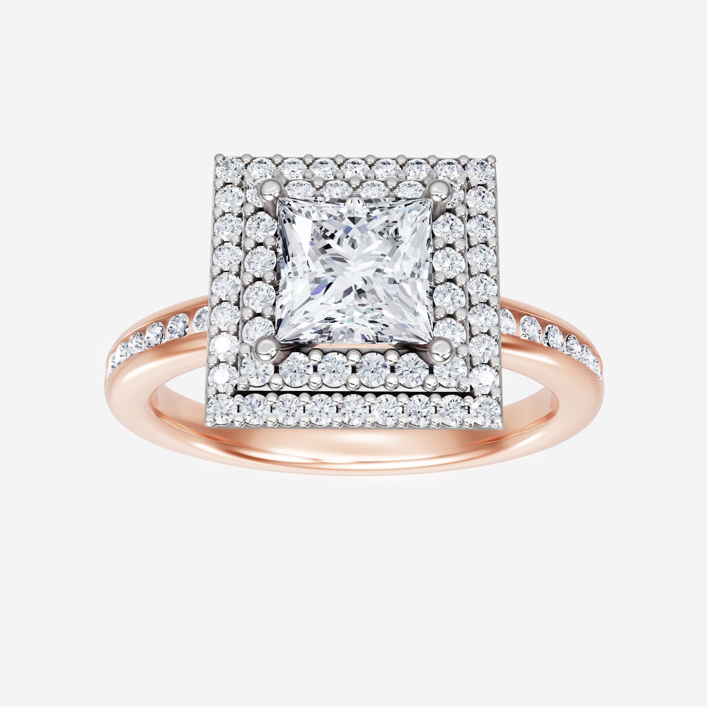 You’ve designed a ring that reflects lasting elegance and grace! Crafted from 18k Rose White Dual Tone, this exquisite Princess lab-grown diamond is the centerpiece of this unique design. This Channel Set Shank with a Double Halo head showcases the brilliance of the Princess diamond, creating a timeless look. This stunning ring makes the perfect symbol of everlasting love and devotion.