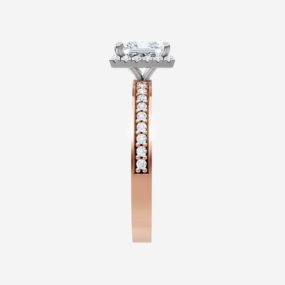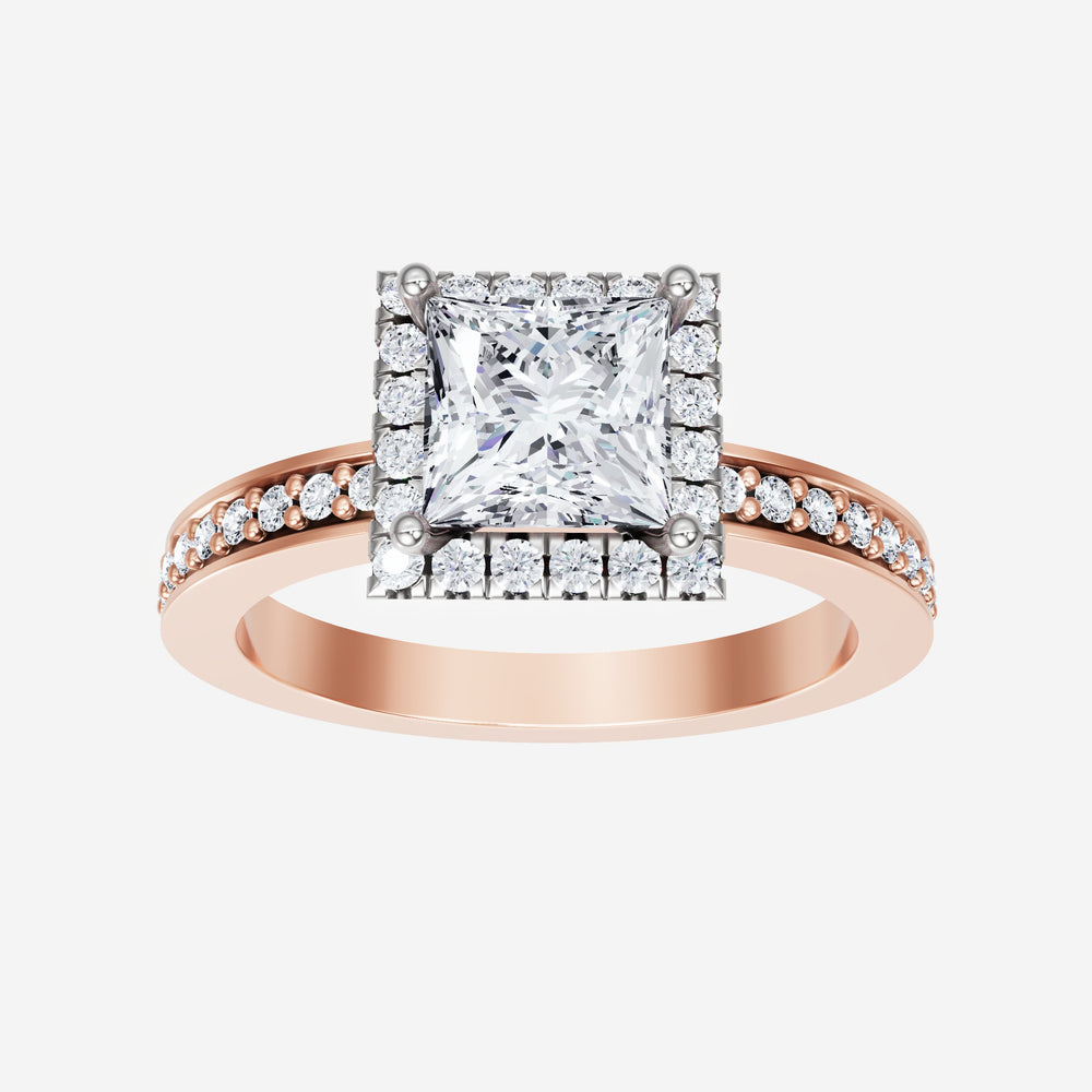 You’ve designed a ring that reflects lasting elegance and grace! Crafted from 18k Rose White Dual Tone, this exquisite Princess lab-grown diamond is the centerpiece of this unique design. This Single Pave Shank with a Micro Halo head showcases the brilliance of the Princess diamond, creating a timeless look. This elegant piece is the perfect symbol of love, strength, and timeless beauty.