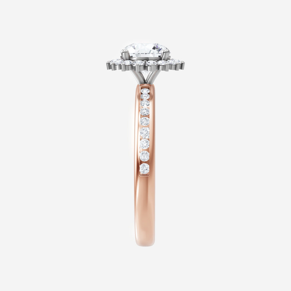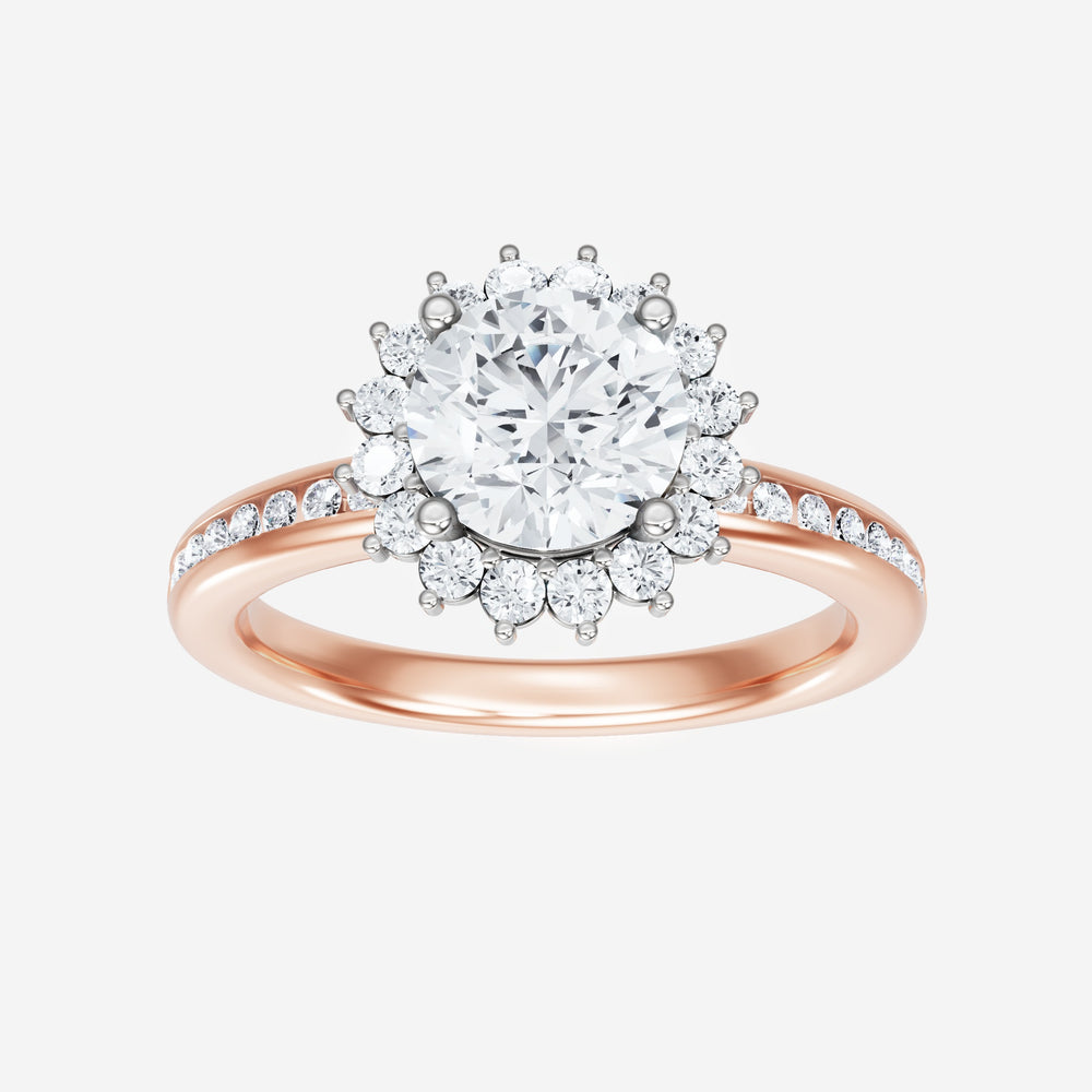 You’ve designed a ring that reflects lasting elegance and grace! Crafted from 18k Rose White Dual Tone, this exquisite Round lab-grown diamond is the centerpiece of this unique design. This Channel Set Shank with a Diana Halo head showcases the brilliance of the Round diamond, creating a timeless look. This stunning ring makes the perfect symbol of everlasting love and devotion.