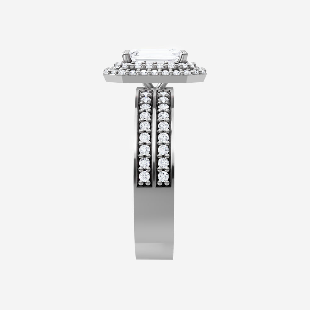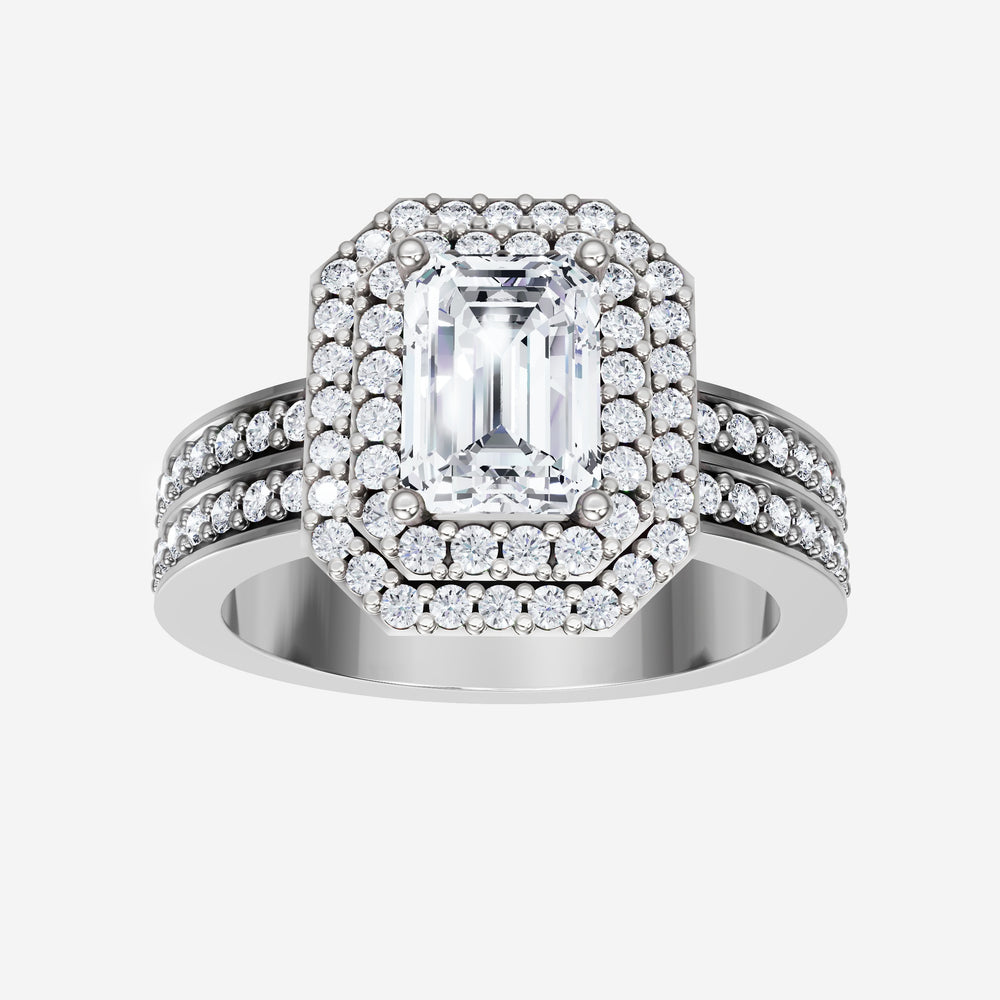 You’ve designed a ring that reflects lasting elegance and grace! Crafted from 18k White Gold, this exquisite Emerald lab-grown diamond is the centerpiece of this unique design. This Double Row Pave with a Double Halo head showcases the brilliance of the Emerald diamond, creating a timeless look. This elegant piece is the perfect symbol of love, strength, and timeless beauty.