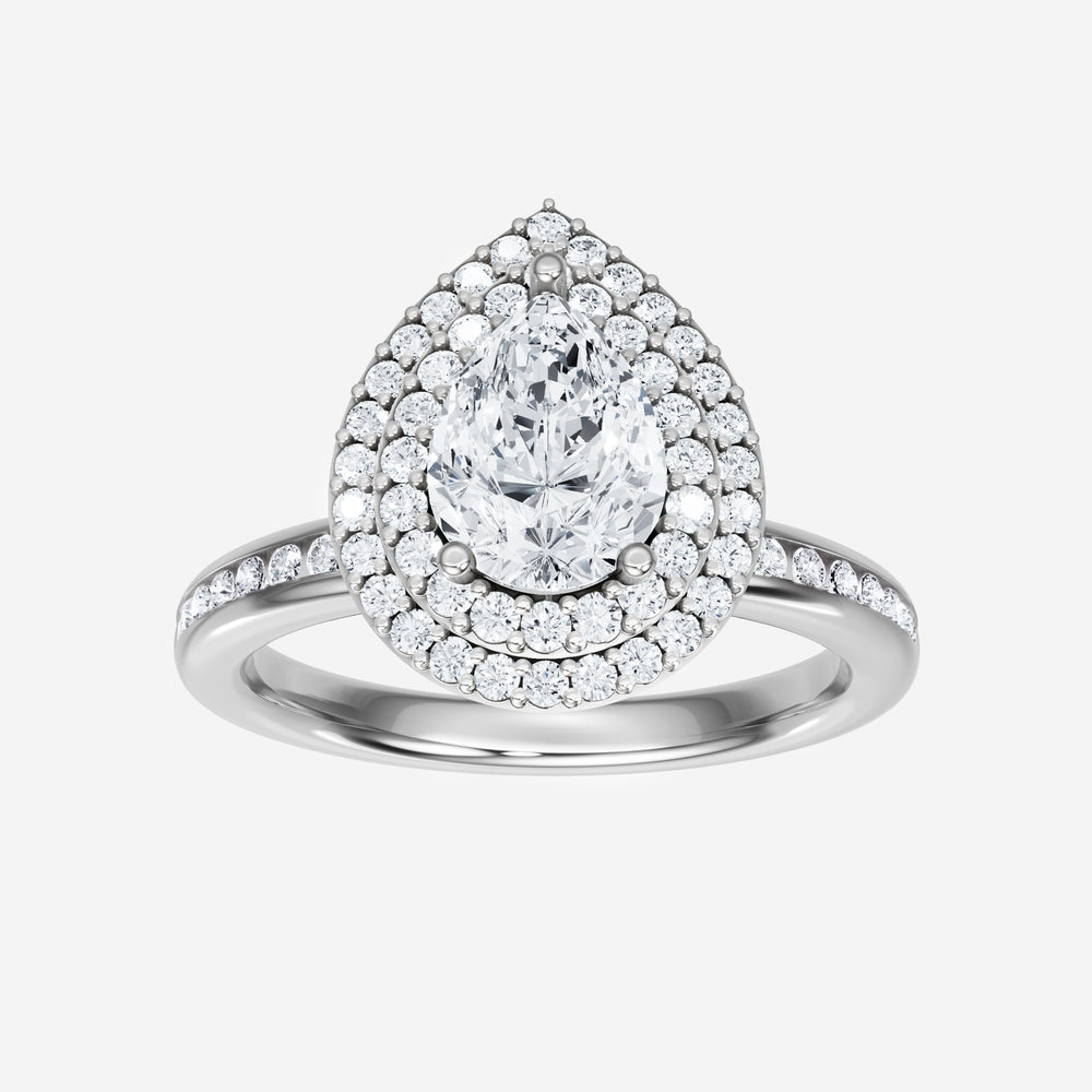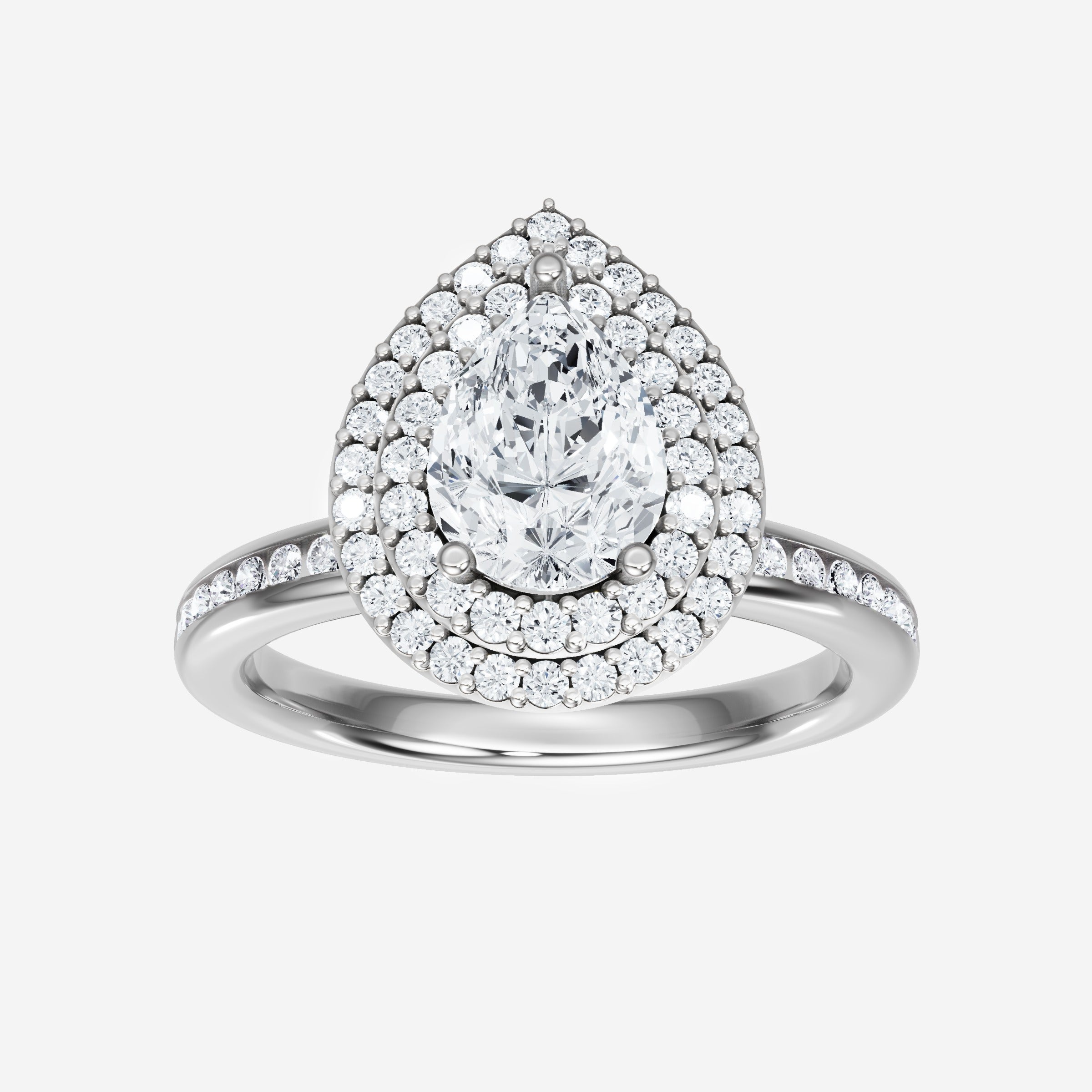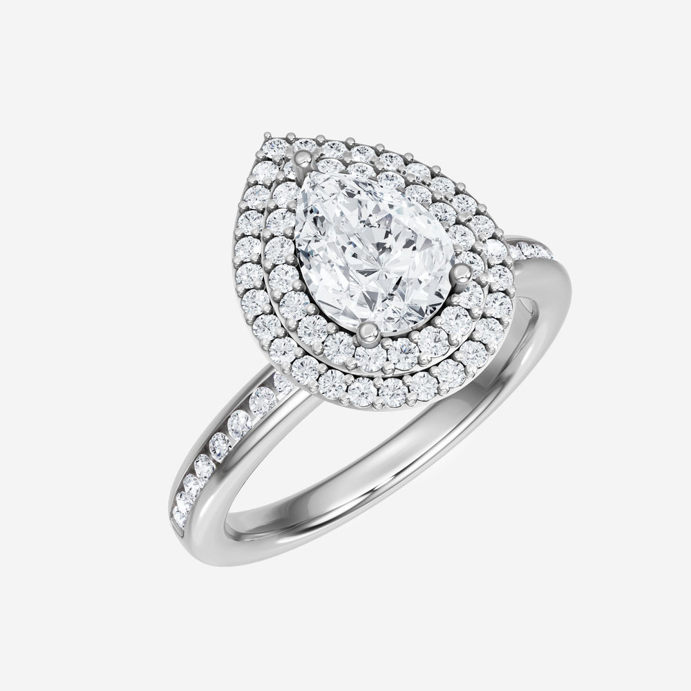 You’ve designed a ring that reflects lasting elegance and grace! Crafted from 18k White Gold, this exquisite Pear lab-grown diamond is the centerpiece of this unique design. This Channel Set Shank with a Double Halo head showcases the brilliance of the Pear diamond, creating a timeless look. This elegant piece is the perfect symbol of love, strength, and timeless beauty.