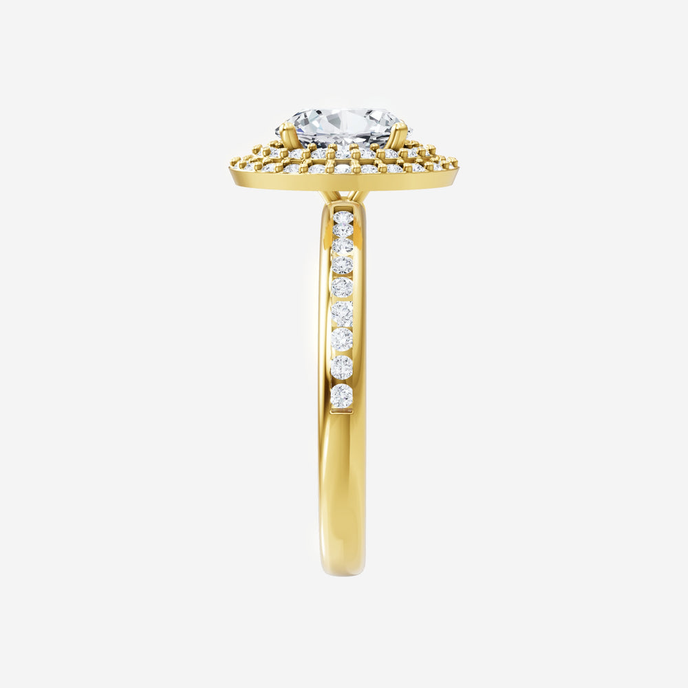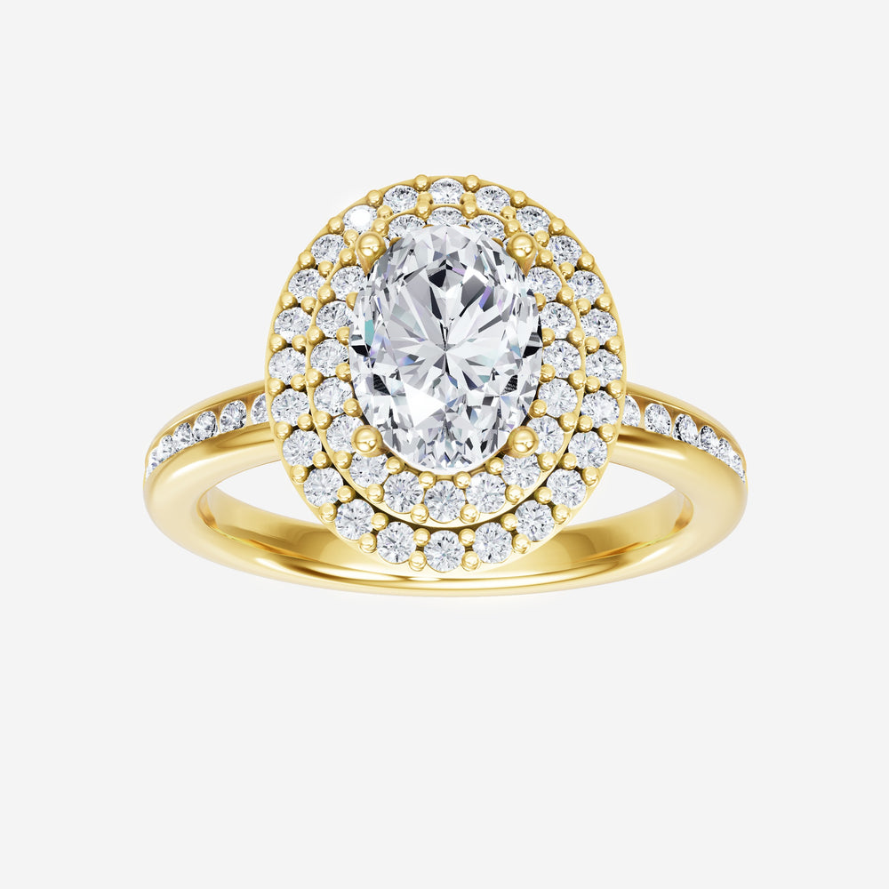 You’ve designed a ring that reflects lasting elegance and grace! Crafted from 18k Yellow Gold, this exquisite Oval lab-grown diamond is the centerpiece of this unique design. This Channel Set Shank with a Double Halo head showcases the brilliance of the Oval diamond, creating a timeless look. This ring will become a cherished reminder of life's most treasured moments.