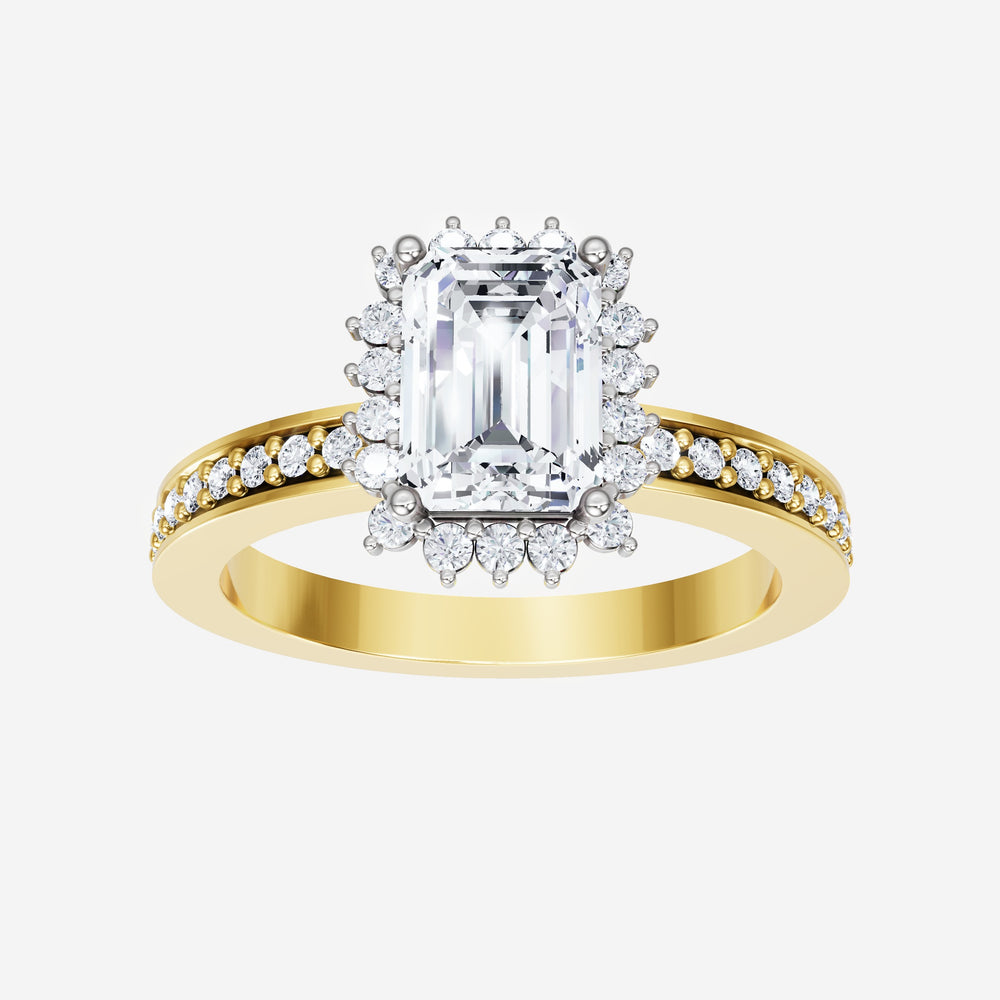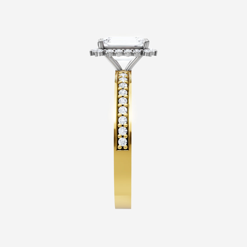 You’ve designed a ring that reflects lasting elegance and grace! Crafted from 18k Yellow White Dual Tone, this exquisite Emerald lab-grown diamond is the centerpiece of this unique design. This Single Pave Shank with a Diana Halo head showcases the brilliance of the Emerald diamond, creating a timeless look. It's a piece of elegance and beauty, perfect for marking life's most beautiful occasions.