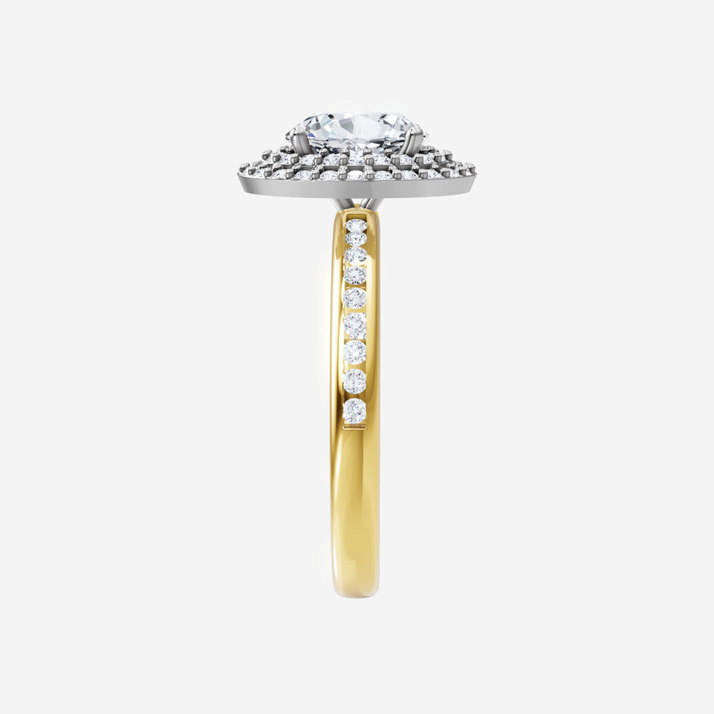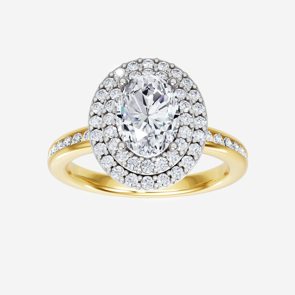 You’ve designed a ring that reflects lasting elegance and grace! Crafted from 18k Yellow White Dual Tone, this exquisite Oval lab-grown diamond is the centerpiece of this unique design. This Channel Set Shank with a Double Halo head showcases the brilliance of the Oval diamond, creating a timeless look. Whether as a gift or a personal treasure, this ring will forever symbolize the most meaningful moments in life.