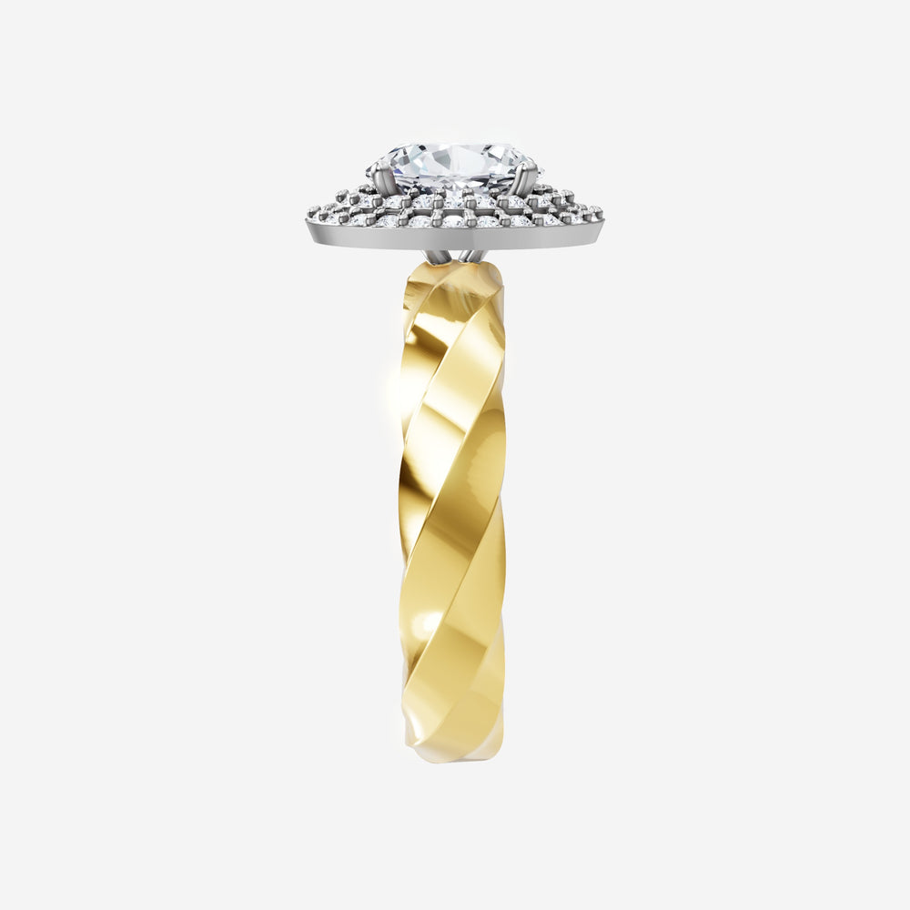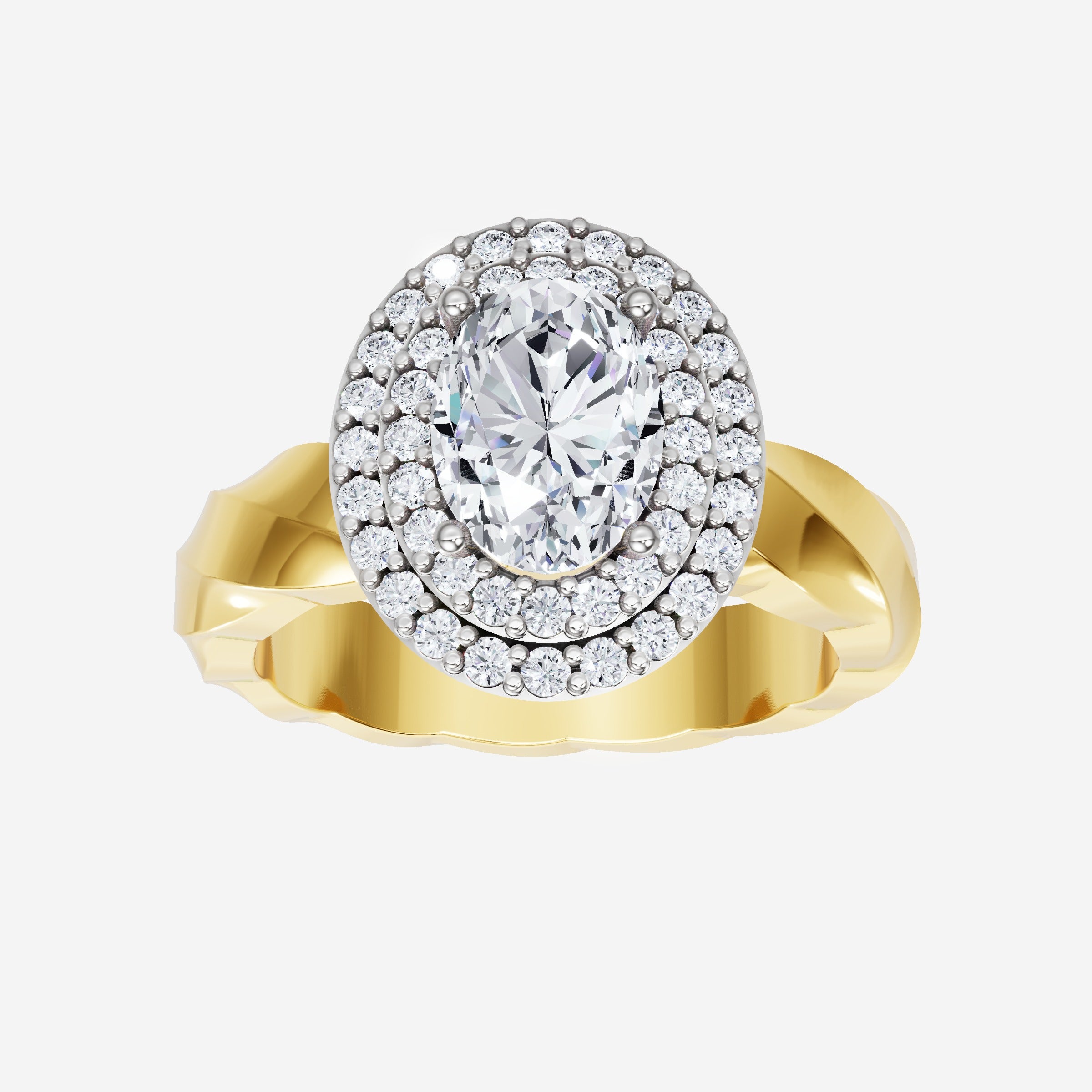You’ve designed a ring that reflects lasting elegance and grace! Crafted from 18k Yellow White Dual Tone, this exquisite Oval lab-grown diamond is the centerpiece of this unique design. This Twisted Shank with a Double Halo head showcases the brilliance of the Oval diamond, creating a timeless look. Ideal for those who seek both beauty and meaning, this ring will stand as a testament to cherished memories.