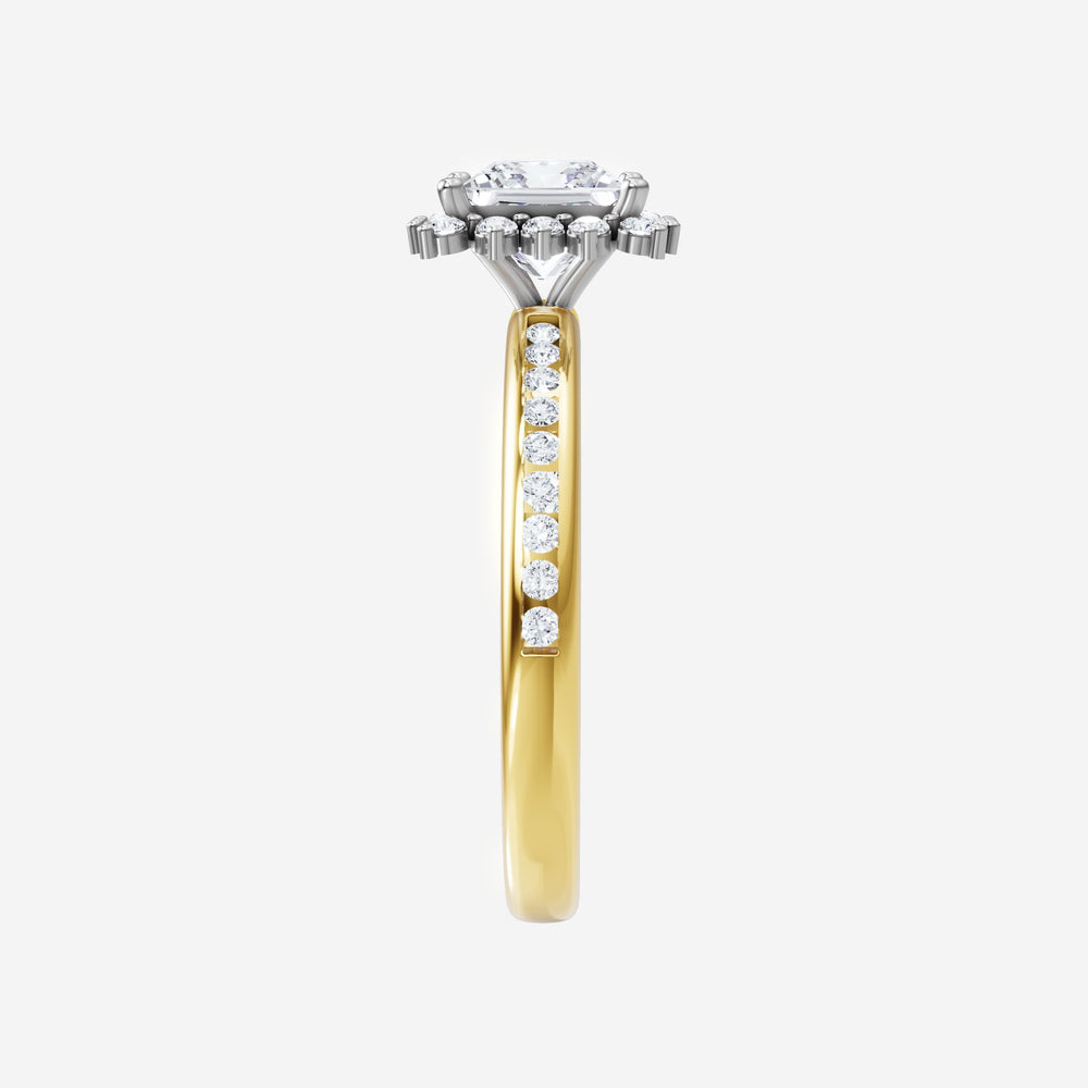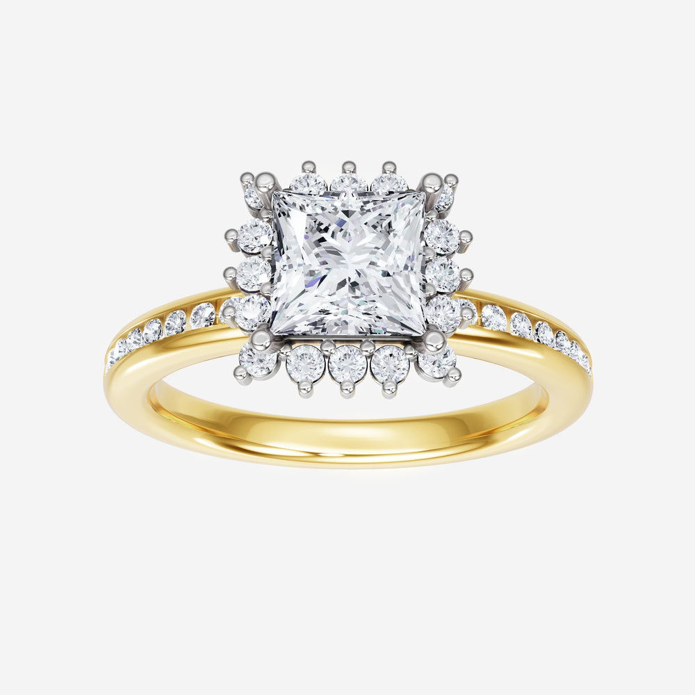 You’ve designed a ring that reflects lasting elegance and grace! Crafted from 18k Yellow White Dual Tone, this exquisite Princess lab-grown diamond is the centerpiece of this unique design. This Channel Set Shank with a Diana Halo head showcases the brilliance of the Princess diamond, creating a timeless look. A perfect choice to celebrate love, commitment, and everything in between.